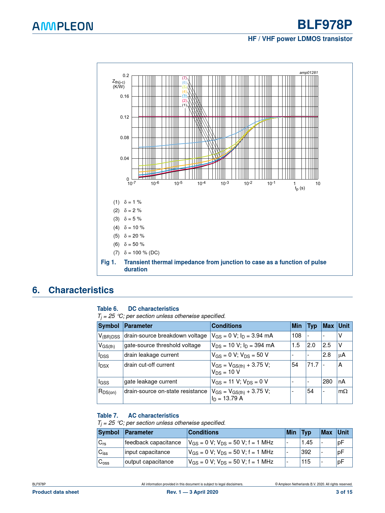 Fig 1. Transient thermal impedance from junction to case as a function of pulse duration 6. Characteristics Table 6. DC characteristics