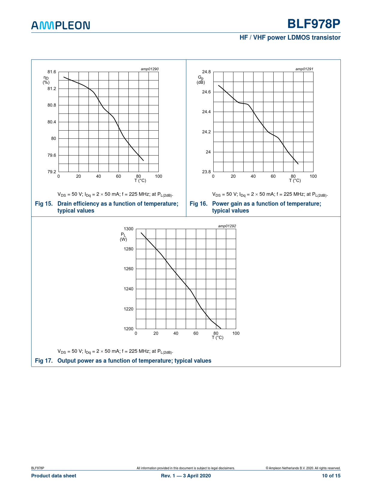 amp01292 1300 PL P (W) (W) (W) 1280 1260 1240 1220 1200 0 20 40 60 80 100 T (°C) VDS = 50 V; IDq = 2 50 mA; f = 225 MHz; at PL(2dB).