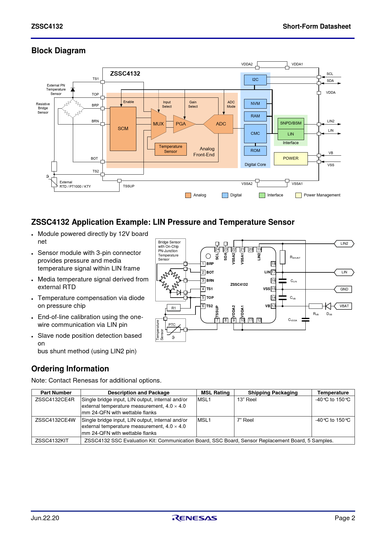 ZSSC4132CE4R Single bridge input, LIN output, internal and/or MSL1 13” Reel -40°C to 150°C external temperature measurement, 4.0  4.0 mm 24-QFN with wettable flanks ZSSC4132CE4W Single bridge input, LIN output, internal and/or MSL1 7” Reel -40°C to 150°C external temperature measurement, 4.0  4.0 mm 24-QFN with wettable flanks ZSSC4132KIT ZSSC4132 SSC Evaluation Kit: Communication Board, SSC Board, Sensor Replacement Board, 5 Samples. Jun.22.20 Page 2