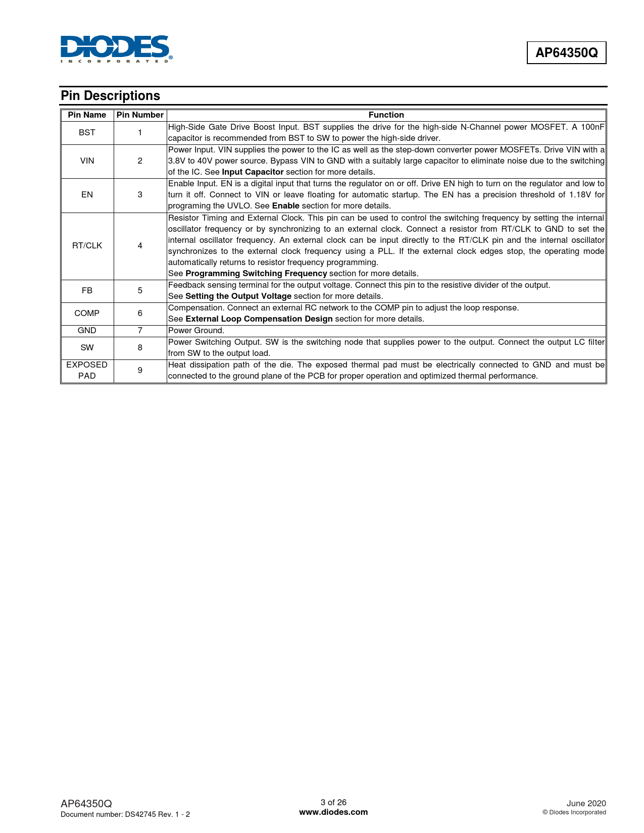 | Pages / Page | 26 / 3 — AP64350Q. Pin Descriptions. Pin Name. Pin Number. Function. Input … |
