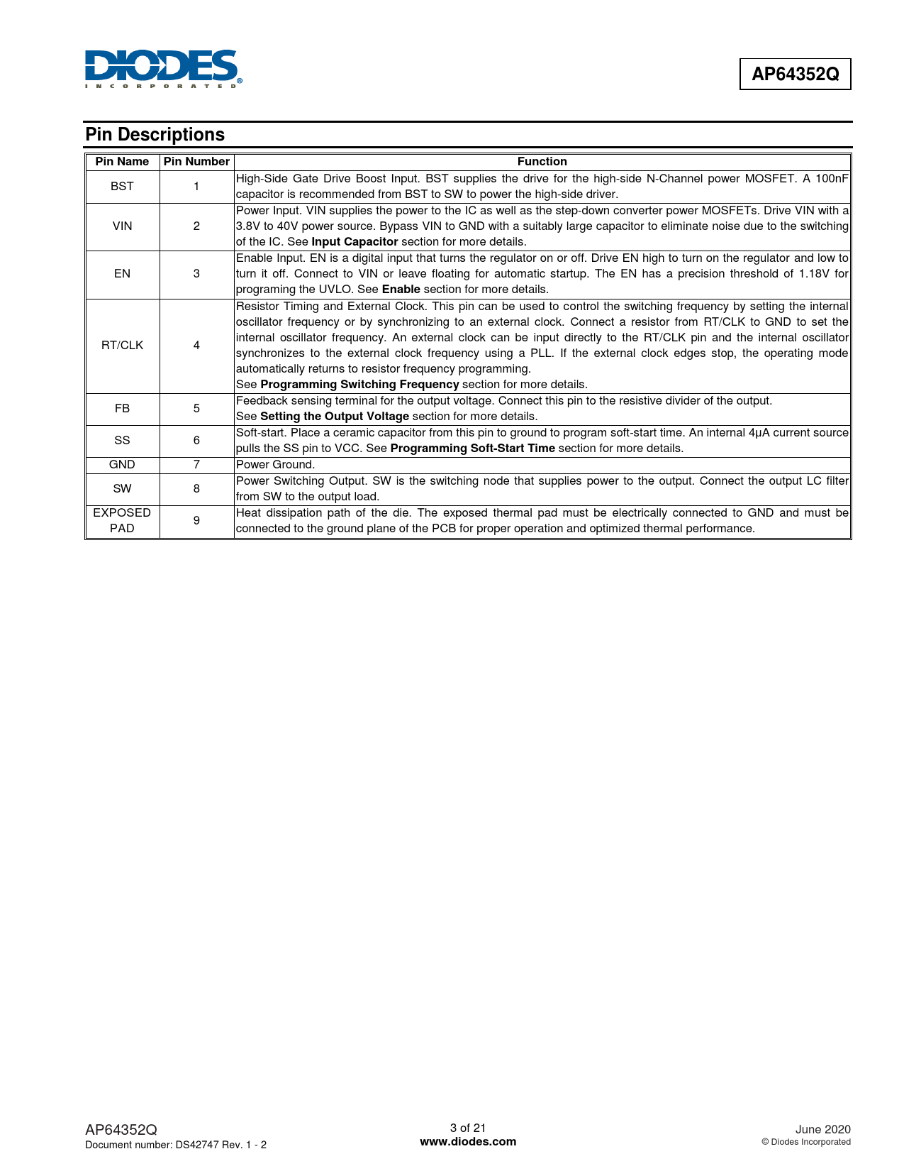 AP64352Q. Pin Descriptions. Pin Name. Pin Number. Function. Input Capacitor. Enable. Programming. Switching Frequency