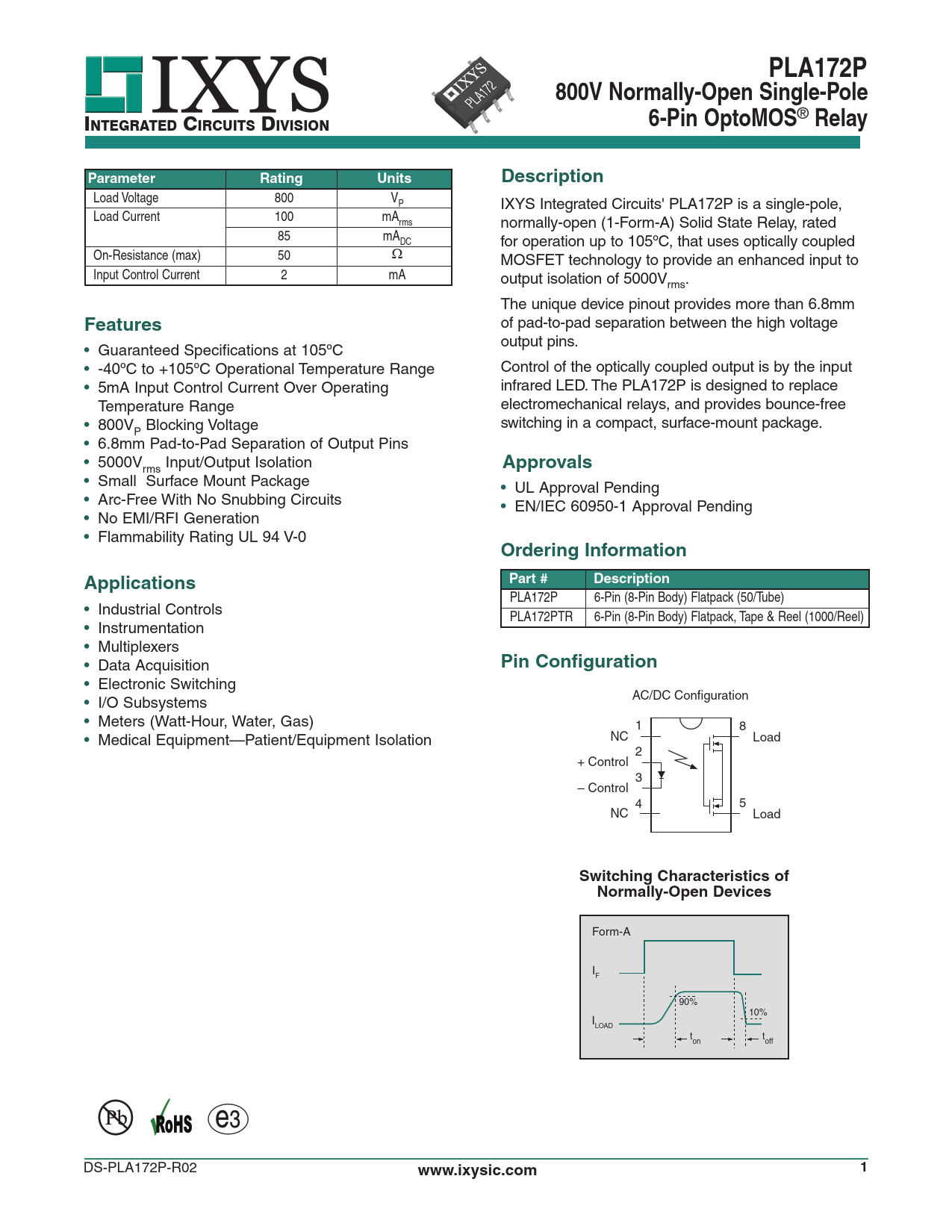 PLA172P. 800V Normally-Open Single-Pole. 6-Pin OptoMOS. Relay. Parameter. Rating. Units. Description. Features. Approvals