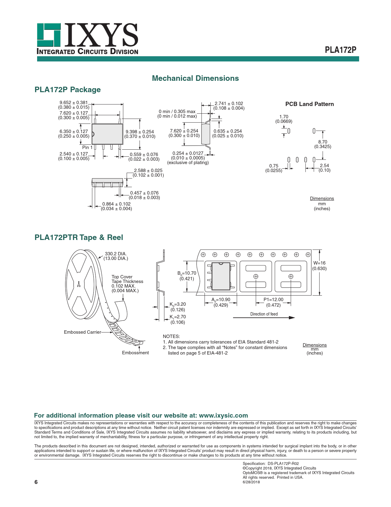 IXYS Integrated Circuits makes no representations or warranties with respect to the accuracy or completeness of the contents of this publication and reserves the right to make changes to specifications and product descriptions at any time without notice. Neither circuit patent licenses nor indemnity are expressed or implied. Except as set forth in IXYS Integrated Circuits' Standard Terms and Conditions of Sale, IXYS Integrated Circuits assumes no liability whatsoever, and disclaims any express or implied warranty, relating to its products including, but not limited to, the implied warranty of merchantability, fitness for a particular purpose, or infringement of any intellectual property right. The products described in this document are not designed, intended, authorized or warranted for use as components in systems intended for surgical implant into the body, or in other applications intended to support or sustain life, or where malfunction of IXYS Integrated Circuits' product may result in direct physical harm, injury, or death to a person or severe property or environmental damage. IXYS Integrated Circuits reserves the right to discontinue or make changes to its products at any time without notice. Specification: DS-PLA172P-R02 ©Copyright 2018, IXYS Integrated Circuits OptoMOS® is a registered trademark of IXYS Integrated Circuits All rights reserved. Printed in USA.