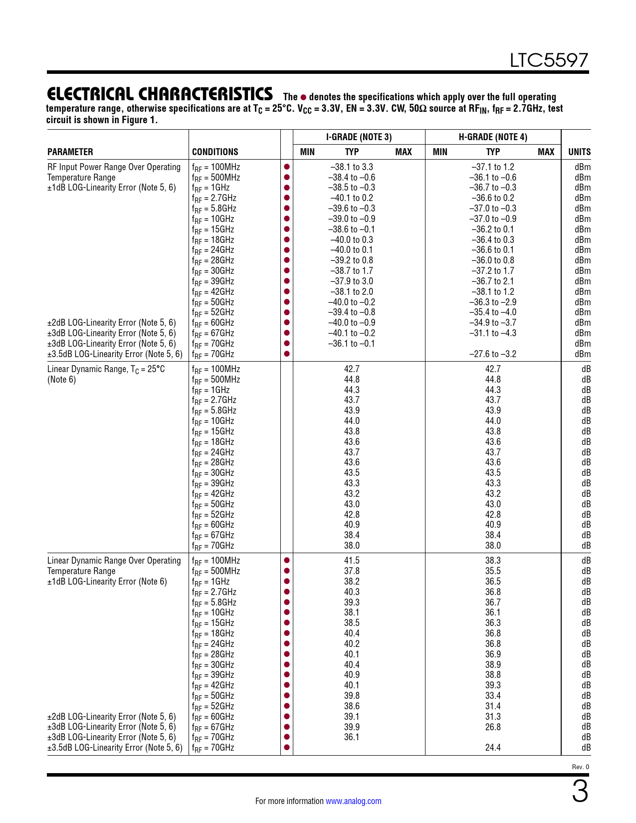 denotes the specifications which apply over the full operating temperature range, otherwise specifications are at TC = 25°C. VCC = 3.3V, EN = 3.3V. CW, 50Ω source at RFIN, fRF = 2.7GHz, test circuit is shown in Figure 1. I-GRADE (NOTE 3) H-GRADE (NOTE 4) PARAMETER CONDITIONS MIN TYP MAX MIN TYP MAX UNITS