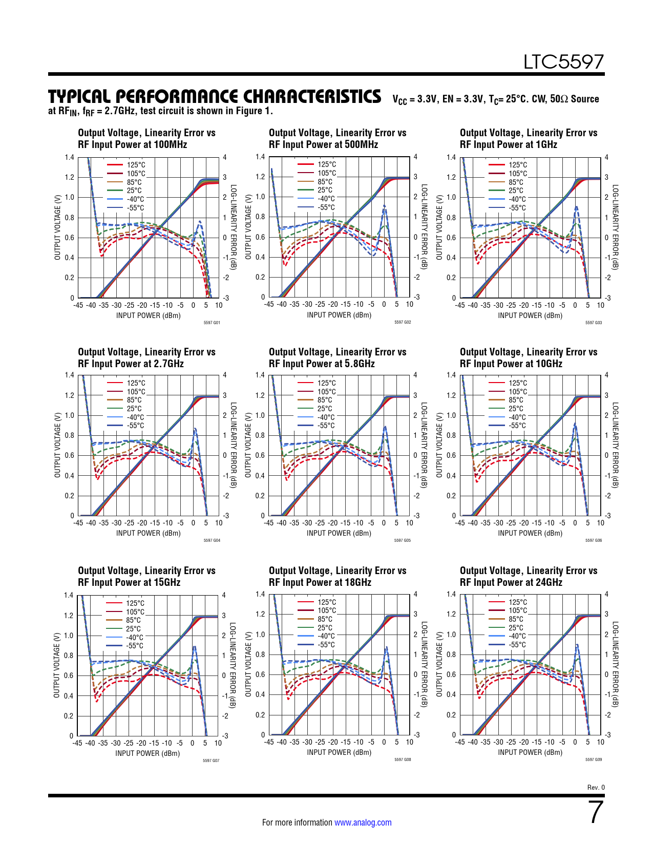 1.4 4 1.4 4 1.4 4 125°C 125°C 125°C 1.2 105°C 3 1.2 105°C 3 1.2 105°C 3 85°C LOG-LINEARIT 85°C LOG-LINEARIT 85°C LOG-LINEARIT 25°C 25°C 25°C 1.0 2 -40°C 1.0 2 -40°C 1.0 2 -40°C -55°C -55°C -55°C TAGE (V) 0.8 1 TAGE (V) 0.8 1 TAGE (V) 0.8 1 Y ERROR (dB) Y ERROR (dB) Y ERROR (dB) 0.6 0 0.6 0 0.6 0 OUTPUT VOL 0.4 -1 OUTPUT VOL 0.4 -1 OUTPUT VOL 0.4 -1 0.2 -2 0.2 -2 0.2 -2 0 -3 0 -3 0 -3 -45 -40 -35 -30 -25 -20 -15 -10 -5 0 5 10 -45 -40 -35 -30 -25 -20 -15 -10 -5 0 5 10 -45 -40 -35 -30 -25 -20 -15 -10 -5 0 5 10 INPUT POWER (dBm) INPUT POWER (dBm) INPUT POWER (dBm) 5597 G01 5597 G02 5597 G03