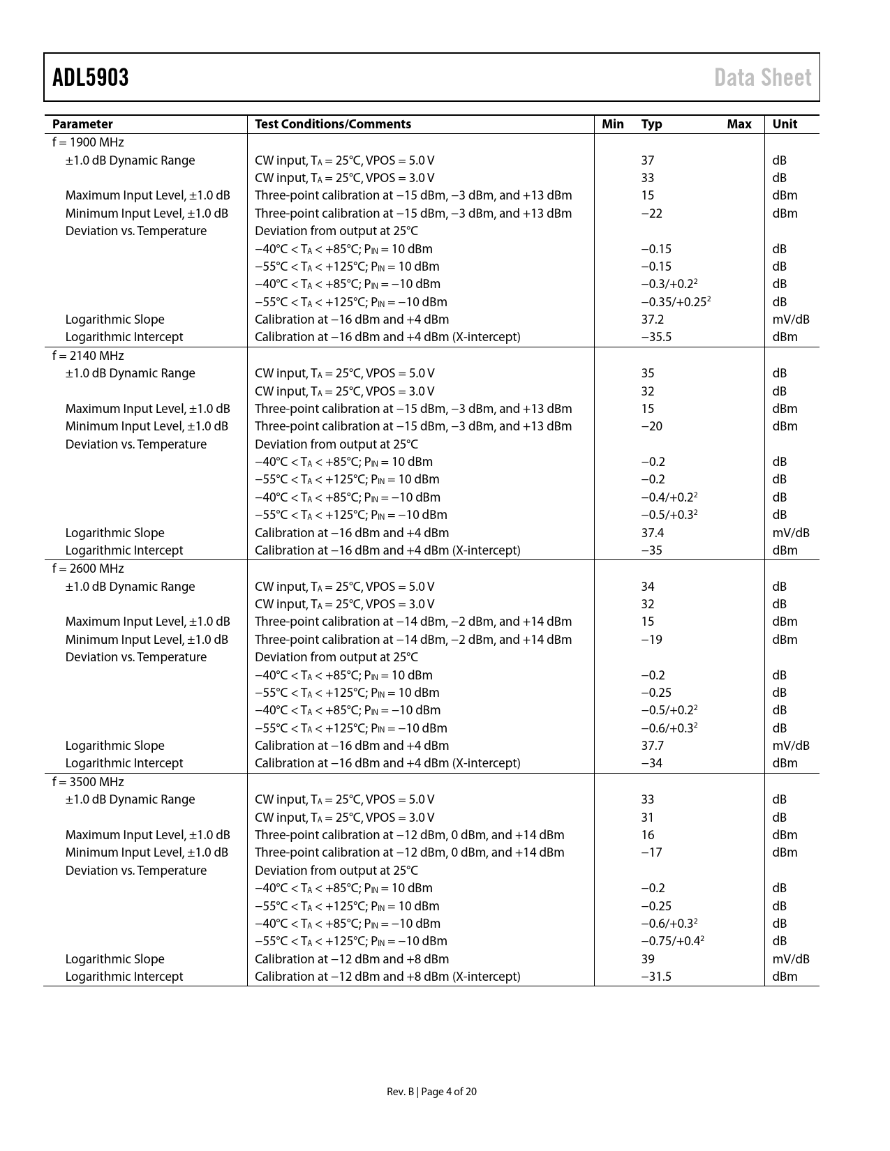 Pages / Page20 / 4 — ADL5903. Data Sheet. Parameter. Test Conditions/Comments. Min Typ. Max. …