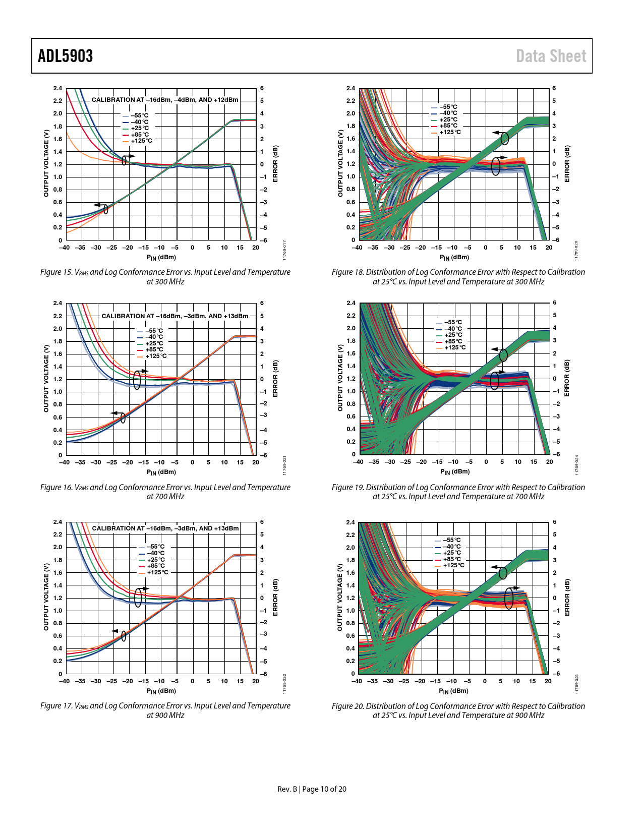 ADL5903Data Sheet2.462.462.2CALIBRATION AT –16dBm, –4dBm, AND +12dBm52.25–55°C2.04–55°C2.0–40°C4–40°C+25°C1.83+25°C1.8+85°C3+85°C+125°C1.621.62E (V)+125°CE (V)GGA 1.41B)B)dA 1.41dLTLTO 1.20R (O 1.20R (T VT VU 1.0–1RROU 1.0–1RROEETPTP0.8–20.8–2OUOU0.6–30.6–30.4–40.4–40.2–50.2–50–60–6–40 –35 –30 –25 –20 –15 –10–505101520 017 –40 –35–30 –25 –20 –15 –10–505101520 020 PIN (dBm)P 11769- IN (dBm) 11769- Figure 15. VRMS and Log Conformance Error vs. Input Level and Temperature Figure 18. Distribution of Log Conformance Error with Respect to Calibration at 300 MHz at 25°C vs. Input Level and Temperature at 300 MHz 2.462.462.2CALIBRATION AT –16dBm, –3dBm, AND +13dBm52.25–55°C2.04–55°C2.0–40°C4–40°C+25°C1.83+25°C1.8+85°C3+85°C+125°C1.621.62E (V)+125°CE (V)GGA 1.41B)B)dA 1.41dLTLTO 1.20R (O 1.20R (T VT VU 1.0–1RROU 1.0–1RROEETPTP0.8–20.8–2OUOU0.6–30.6–30.4–40.4–40.2–50.2–50–60–6–40 –35 –30 –25 –20 –15 –10–505101520 021 –40 –35 –30 –25 –20 –15 –10–505101520 024 PIN (dBm)P 11769- IN (dBm) 11769- Figure 16. VRMS and Log Conformance Error vs. Input Level and Temperature Figure 19. Distribution of Log Conformance Error with Respect to Calibration at 700 MHz at 25°C vs. Input Level and Temperature at 700 MHz 2.462.46CALIBRATION AT –16dBm, –3dBm, AND +13dBm2.252.25–55°C2.0–55°C42.0–40°C4–40°C+25°C1.8+25°C31.8+85°C3+85°C+125°C1.6+125°C21.62E (V)E (V)GGA 1.41B)B)dA 1.41dLTLTO 1.20R (O 1.20R (T VT VU 1.0–1RROU 1.0–1RROEETPTP0.8–20.8–2OUOU0.6–30.6–30.4–40.4–40.2–50.2–50–60–6–40 –35 –30 –25 –20 –15 –10–505101520 022 –40 –35 –30 –25 –20 –15 –10–505101520 025 PIN (dBm)P 11769- IN (dBm) 11769- Figure 17. VRMS and Log Conformance Error vs. Input Level and Temperature Figure 20. Distribution of Log Conformance Error with Respect to Calibration at 900 MHz at 25°C vs. Input Level and Temperature at 900 MHz Rev. B | Page 10 of 20 Document Outline FEATURES APPLICATIONS FUNCTIONAL BLOCK DIAGRAM GENERAL DESCRIPTION TABLE OF CONTENTS REVISION HISTORY SPECIFICATIONS ABSOLUTE MAXIMUM RATINGS ESD CAUTION PIN CONFIGURATION AND FUNCTION DESCRIPTIONS TYPICAL PERFORMANCE CHARACTERISTICS MEASUREMENT SETUPS THEORY OF OPERATION RF INPUT INTERFACE BASIC CONNECTIONS CHOOSING A VALUE FOR CRMS DEVICE CALIBRATION AND ERROR CALCULATION EVALUATION BOARD SCHEMATIC AND CONFIGURATION OPTIONS OUTLINE DIMENSIONS ORDERING GUIDE