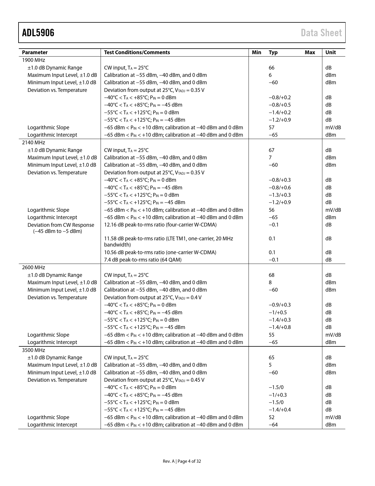 Pages / Page32 / 4 — ADL5906. Data Sheet. Parameter. Test Conditions/Comments. Min. Typ. Max. …