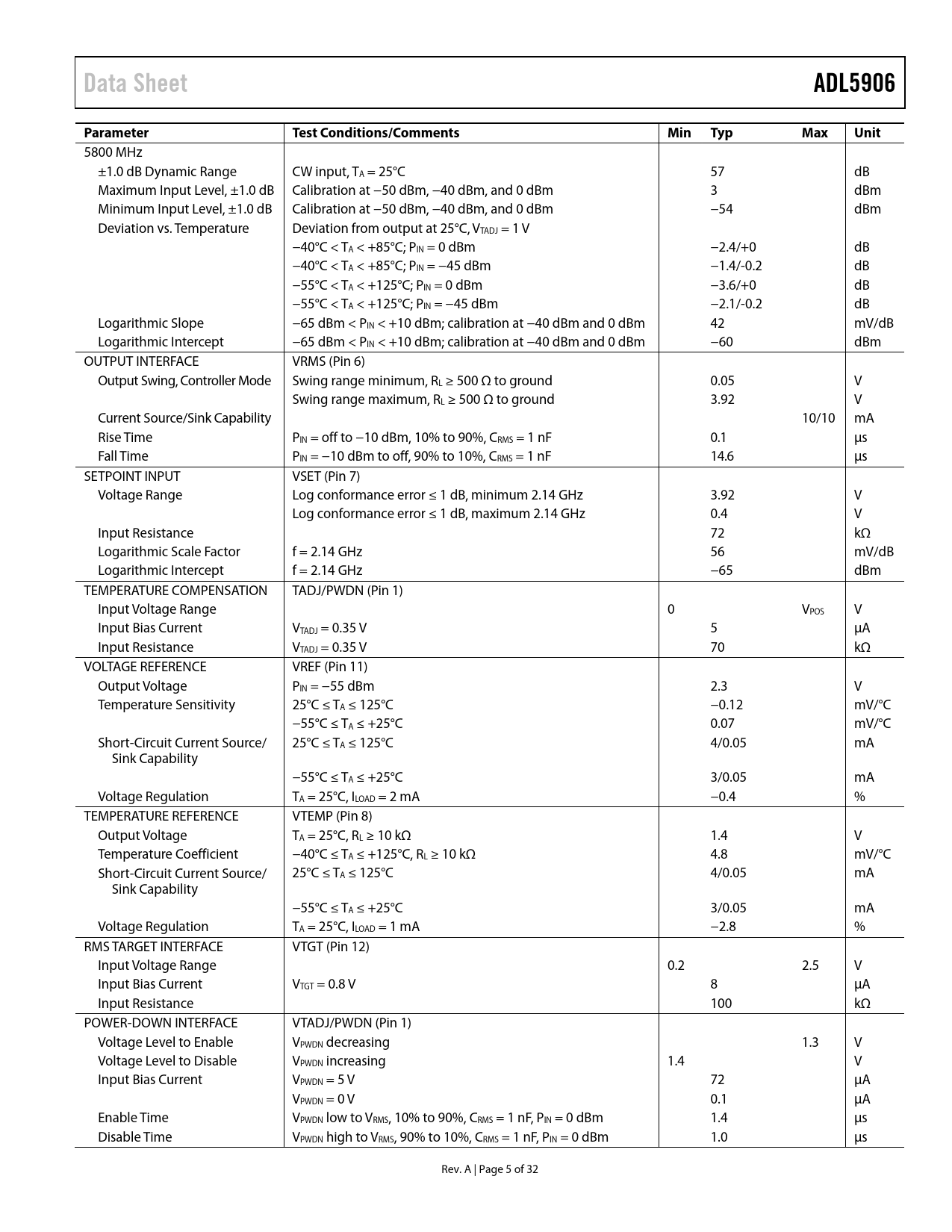 Data SheetADL5906ParameterTest Conditions/CommentsMinTypMaxUnit 5800 MHz ±1.0 dB Dynamic Range CW input, TA = 25°C 57 dB Maximum Input Level, ±1.0 dB Calibration at −50 dBm, −40 dBm, and 0 dBm 3 dBm Minimum Input Level, ±1.0 dB Calibration at −50 dBm, −40 dBm, and 0 dBm −54 dBm Deviation vs. Temperature Deviation from output at 25°C, VTADJ = 1 V −40°C < TA < +85°C; PIN = 0 dBm −2.4/+0 dB −40°C < TA < +85°C; PIN = −45 dBm −1.4/-0.2 dB −55°C < TA < +125°C; PIN = 0 dBm −3.6/+0 dB −55°C < TA < +125°C; PIN = −45 dBm −2.1/-0.2 dB Logarithmic Slope −65 dBm < PIN < +10 dBm; calibration at −40 dBm and 0 dBm 42 mV/dB Logarithmic Intercept −65 dBm < PIN < +10 dBm; calibration at −40 dBm and 0 dBm −60 dBm OUTPUT INTERFACE VRMS (Pin 6) Output Swing, Control er Mode Swing range minimum, RL ≥ 500 Ω to ground 0.05 V Swing range maximum, RL ≥ 500 Ω to ground 3.92 V Current Source/Sink Capability 10/10 mA Rise Time PIN = off to −10 dBm, 10% to 90%, CRMS = 1 nF 0.1 µs Fall Time PIN = −10 dBm to off, 90% to 10%, CRMS = 1 nF 14.6 µs SETPOINT INPUT VSET (Pin 7) Voltage Range Log conformance error ≤ 1 dB, minimum 2.14 GHz 3.92 V Log conformance error ≤ 1 dB, maximum 2.14 GHz 0.4 V Input Resistance 72 kΩ Logarithmic Scale Factor f = 2.14 GHz 56 mV/dB Logarithmic Intercept f = 2.14 GHz −65 dBm TEMPERATURE COMPENSATION TADJ/PWDN (Pin 1) Input Voltage Range 0 VPOS V Input Bias Current VTADJ = 0.35 V 5 µA Input Resistance VTADJ = 0.35 V 70 kΩ VOLTAGE REFERENCE VREF (Pin 11) Output Voltage PIN = −55 dBm 2.3 V Temperature Sensitivity 25°C ≤ TA ≤ 125°C −0.12 mV/°C −55°C ≤ TA ≤ +25°C 0.07 mV/°C Short-Circuit Current Source/ 25°C ≤ TA ≤ 125°C 4/0.05 mA Sink Capability −55°C ≤ TA ≤ +25°C 3/0.05 mA Voltage Regulation TA = 25°C, ILOAD = 2 mA −0.4 % TEMPERATURE REFERENCE VTEMP (Pin 8) Output Voltage TA = 25°C, RL ≥ 10 kΩ 1.4 V Temperature Coefficient −40°C ≤ TA ≤ +125°C, RL ≥ 10 kΩ 4.8 mV/°C Short-Circuit Current Source/ 25°C ≤ TA ≤ 125°C 4/0.05 mA Sink Capability −55°C ≤ TA ≤ +25°C 3/0.05 mA Voltage Regulation TA = 25°C, ILOAD = 1 mA −2.8 % RMS TARGET INTERFACE VTGT (Pin 12) Input Voltage Range 0.2 2.5 V Input Bias Current VTGT = 0.8 V 8 µA Input Resistance 100 kΩ POWER-DOWN INTERFACE VTADJ/PWDN (Pin 1) Voltage Level to Enable VPWDN decreasing 1.3 V Voltage Level to Disable VPWDN increasing 1.4 V Input Bias Current VPWDN = 5 V 72 µA VPWDN = 0 V 0.1 µA Enable Time VPWDN low to VRMS, 10% to 90%, CRMS = 1 nF, PIN = 0 dBm 1.4 µs Disable Time VPWDN high to VRMS, 90% to 10%, CRMS = 1 nF, PIN = 0 dBm 1.0 µs Rev. A | Page 5 of 32 Document Outline Features Applications Functional Block Diagram General Description Table of Contents Revision History Specifications Absolute Maximum Ratings ESD Caution Pin Configuration and Function Descriptions Typical Performance Characteristics Theory of Operation Square Law Detector and Amplitude Target RF Input Interface Temperature Sensor Interface VREF Interface Temperature Compensation Interface Power-Down Interface VSET Interface Output Interface VTGT Interface Basis for Error Calculations Measurement Mode Basic Connections Setting VTADJ Setting VTGT Choosing a Value for CRMS Output Voltage Scaling System Calibration and Error Calculation Using VTEMP to Improve Intercept Temperature Drift Description of Characterization Evaluation Board Evaluation Board Assembly Drawings Outline Dimensions Ordering Guide