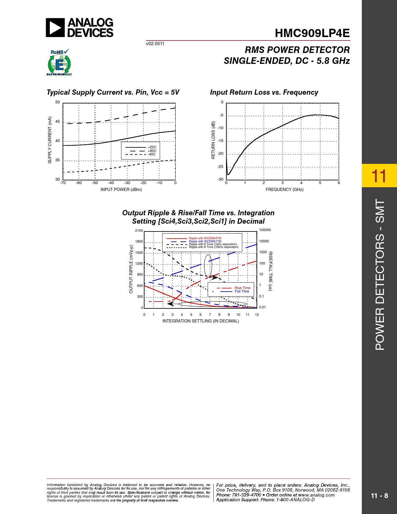 HMC909LP4E v02.0511 RMS POWER DETECTORSINGLE-ENDED, DC - 5.8 GHzTypical Supply Current vs. Pin, Vcc = 5VInput Return Loss vs. Frequency 50 0 -5 45 (mA) (dB) -10 40 LOSS -15 CURRENT +25C +85C -40C -20 35 RETURN SUPPLY -25 30 -30 -70 -60 -50 -40 -30 -20 -10 0 0 1 2 3 4 5 6 11 INPUT POWER (dBm) FREQUENCY (GHz) t Output Ripple & Rise/Fall Time vs. Integration M Setting [Sci4,Sci3,Sci2,Sci1] in Decimal s 2100 100000 - Ripple with WCDMA4TM 1800 Ripple with WCDMA1TM 10000 Ripple with 8 Tone (1kHz seperation) Ripple with 8 Tone (10kHz seperation) RI rs 1500 1000 SE/ o FALL TI 1200 100 t 900 10 c ME (us) e 600 1 Rise Time t Fall Time OUTPUT RIPPLE (mVp-p) 300 0.1 e 0 0.01 D 0 1 2 3 4 5 6 7 8 9 10 11 12 r INTEGRATION SETTLING (IN DECIMAL) e w o P Info F rmoatr p ion rfiurcne is , d hed ebly ivAe n r al y a og D n evd t ice o p s is bla eli c eve o ed t rd o b e e ras: H ccuratite tiatne M d reli iac bl reo . w Ho av wev e C er, n o o For price, delivery, and to place orders: Analog Devices, Inc., responsibility is assumed by Analog Devices for its use, nor for any infringements of patents or other rporation, 20 Alpha Road, Chelmsford, MA 01824 One Technology Way, P.O. Box 9106, Norwood, MA 02062-9106 Phone: 978-250-3343 Fax: 978-250-3373 O rights of third parties that may result from its use. Specifications subject to change without notice. No P rd ho e ne r O : 7 n 81- -3li 2n 9 e a -47 t w 0 w 0 • O w rd .h e it r o tniltie n .c e ao t m license is granted by implication or otherwise under any patent or patent rights of Analog Devices. www.analog.com 11 - 8 Application Support: Pho Trademarks and registered trademarks are the property of their respective owners. ne: 978-250-33 A 4 p 3 o plica r a tio p n S p u s p @ po h rt itt : P ite ho . n c e o : 1m -800-ANALOG-D