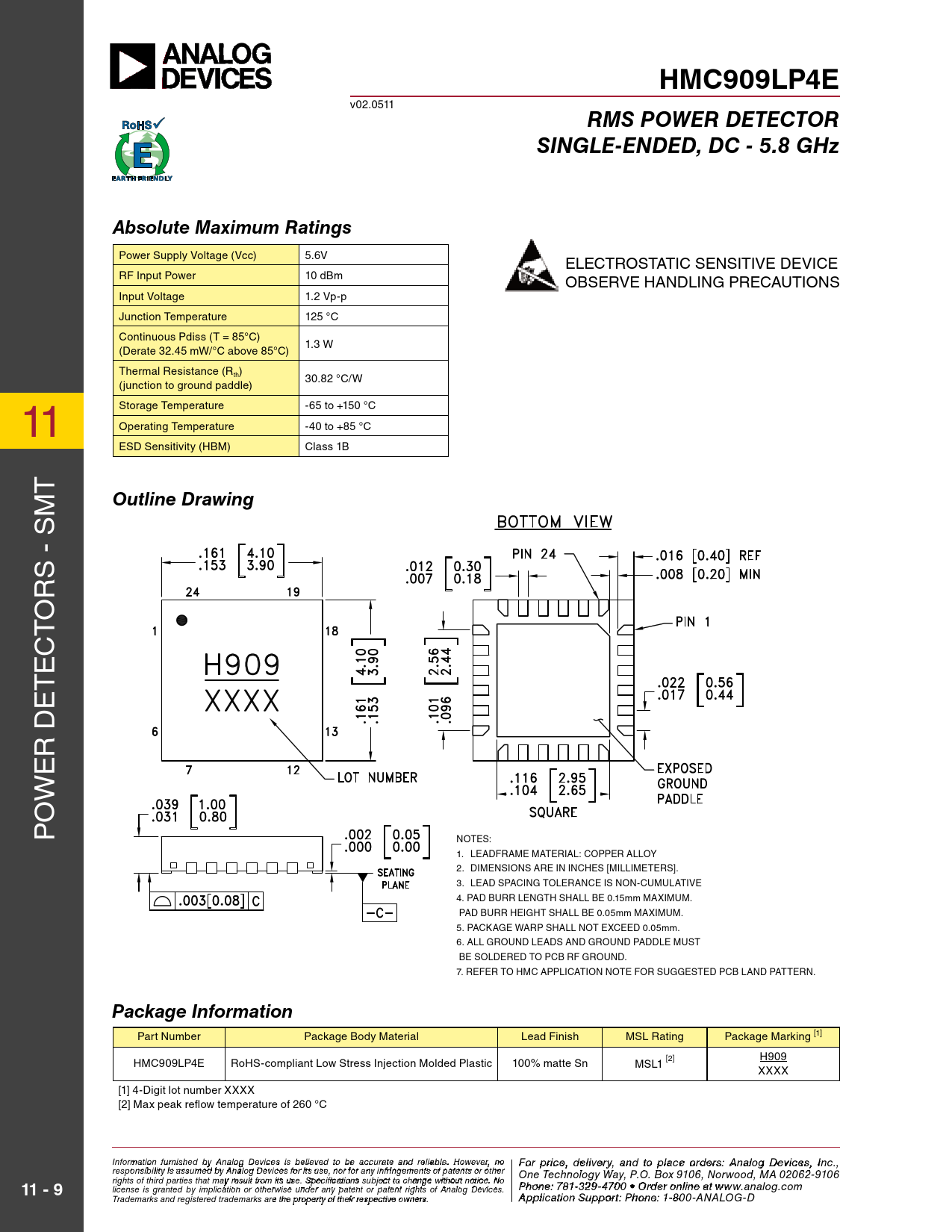 HMC909LP4E. RMS POWER DETECTOR. SINGLE-ENDED, DC - 5.8 GHz. Absolute Maximum Ratings. Outline Drawing. Package Information. 11 - 9
