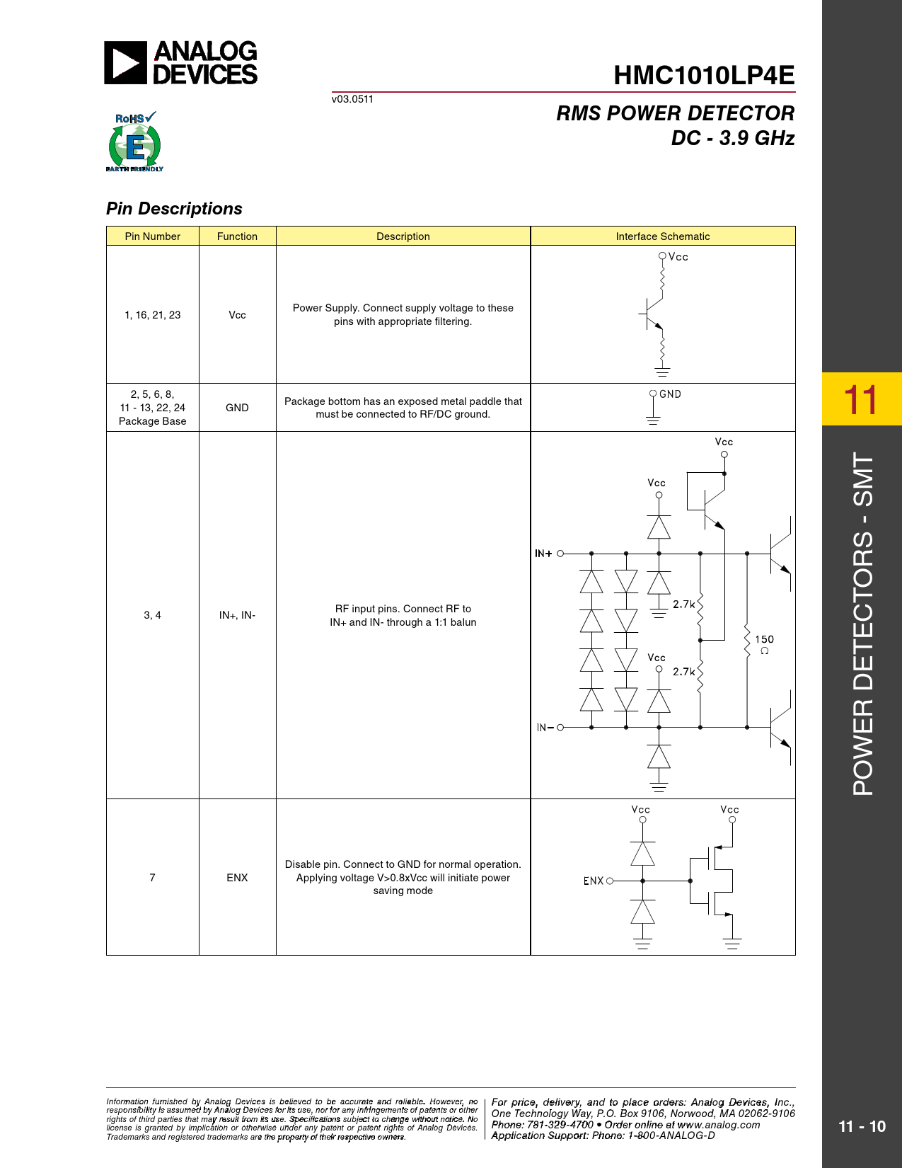 HMC1010LP4E v03.0511 RMS POWER DETECTORDC - 3.9 GHzPin Descriptions Pin Number Function Description Interface schematic Power supply. connect supply voltage to these 1, 16, 21, 23 Vcc pins with appropriate filtering. 2, 5, 6, 8, Package bottom has an exposed metal paddle that 11 - 13, 22, 24 GND must be connected to rF/Dc ground. 11 Package Base t M s - rs o t rF input pins. connect rF to 3, 4 IN+, IN- IN+ and IN- through a 1:1 balun c e t e D r e w o P Disable pin. connect to GND for normal operation. 7 eNX Applying voltage V>0.8xVcc will initiate power saving mode Info F rmoatr p ion rfiurcne is , d hed ebly ivAe n r al y a og D n evd t ice o p s is bla eli c eve o ed t rd o b e e ras: H ccuratite tiatne M d reli iac bl reo . w Ho av wev e C er, n o o For price, delivery, and to place orders: Analog Devices, Inc., responsibility is assumed by Analog Devices for its use, nor for any infringements of patents or other rporation, 20 Alpha Road, Chelmsford, MA 01824 One Technology Way, P.O. Box 9106, Norwood, MA 02062-9106 Phone: 978-250-3343 Fax: 978-250-3373 O rights of third parties that may result from its use. Specifications subject to change without notice. No P rd ho e ne r O : 7 n 81- -3li 2n 9 e a -47 t w 0 w 0 • O w rd .h e it r o tniltie n .c e ao t m license is granted by implication or otherwise under any patent or patent rights of Analog Devices. www.analog.com 11 - 10 Application Support: Pho Trademarks and registered trademarks are the property of their respective owners. ne: 978-250-33 A 4 p 3 o plica r a tio p n S p u s p @ po h rt itt : P ite ho . n c e o : 1m -800-ANALOG-D