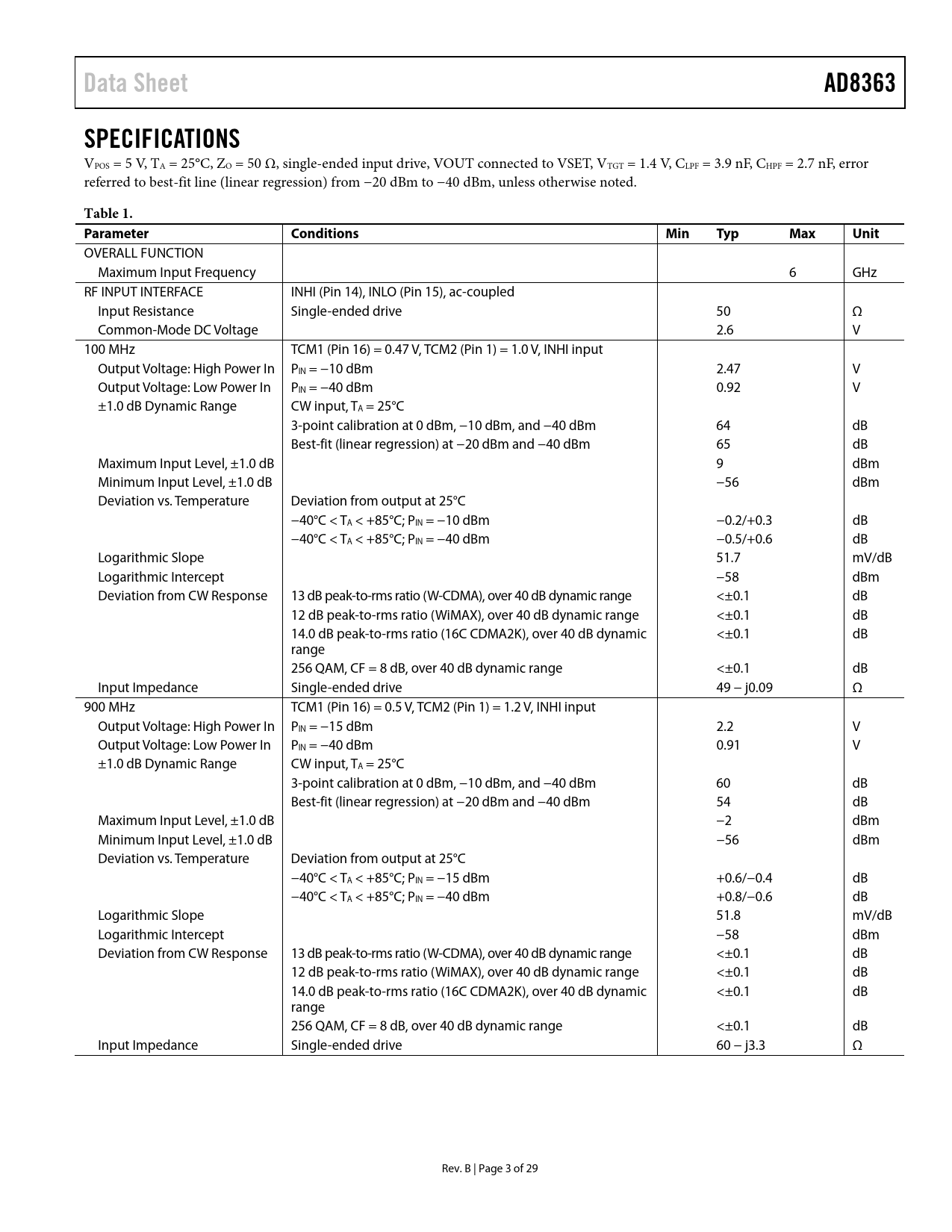 Data SheetAD8363SPECIFICATIONS VPOS = 5 V, TA = 25°C, ZO = 50 Ω, single-ended input drive, VOUT connected to VSET, VTGT = 1.4 V, CLPF = 3.9 nF, CHPF = 2.7 nF, error referred to best-fit line (linear regression) from −20 dBm to −40 dBm, unless otherwise noted. Table 1. ParameterConditionsMinTypMaxUnit OVERALL FUNCTION Maximum Input Frequency 6 GHz RF INPUT INTERFACE INHI (Pin 14), INLO (Pin 15), ac-coupled Input Resistance Single-ended drive 50 Ω Common-Mode DC Voltage 2.6 V 100 MHz TCM1 (Pin 16) = 0.47 V, TCM2 (Pin 1) = 1.0 V, INHI input Output Voltage: High Power In PIN = −10 dBm 2.47 V Output Voltage: Low Power In PIN = −40 dBm 0.92 V ±1.0 dB Dynamic Range CW input, TA = 25°C 3-point calibration at 0 dBm, −10 dBm, and −40 dBm 64 dB Best-fit (linear regression) at −20 dBm and −40 dBm 65 dB Maximum Input Level, ±1.0 dB 9 dBm Minimum Input Level, ±1.0 dB −56 dBm Deviation vs. Temperature Deviation from output at 25°C −40°C < TA < +85°C; PIN = −10 dBm −0.2/+0.3 dB −40°C < TA < +85°C; PIN = −40 dBm −0.5/+0.6 dB Logarithmic Slope 51.7 mV/dB Logarithmic Intercept −58 dBm Deviation from CW Response 13 dB peak-to-rms ratio (W-CDMA), over 40 dB dynamic range <±0.1 dB 12 dB peak-to-rms ratio (WiMAX), over 40 dB dynamic range <±0.1 dB 14.0 dB peak-to-rms ratio (16C CDMA2K), over 40 dB dynamic <±0.1 dB range 256 QAM, CF = 8 dB, over 40 dB dynamic range <±0.1 dB Input Impedance Single-ended drive 49 − j0.09 Ω 900 MHz TCM1 (Pin 16) = 0.5 V, TCM2 (Pin 1) = 1.2 V, INHI input Output Voltage: High Power In PIN = −15 dBm 2.2 V Output Voltage: Low Power In PIN = −40 dBm 0.91 V ±1.0 dB Dynamic Range CW input, TA = 25°C 3-point calibration at 0 dBm, −10 dBm, and −40 dBm 60 dB Best-fit (linear regression) at −20 dBm and −40 dBm 54 dB Maximum Input Level, ±1.0 dB −2 dBm Minimum Input Level, ±1.0 dB −56 dBm Deviation vs. Temperature Deviation from output at 25°C −40°C < TA < +85°C; PIN = −15 dBm +0.6/−0.4 dB −40°C < TA < +85°C; PIN = −40 dBm +0.8/−0.6 dB Logarithmic Slope 51.8 mV/dB Logarithmic Intercept −58 dBm Deviation from CW Response 13 dB peak-to-rms ratio (W-CDMA), over 40 dB dynamic range <±0.1 dB 12 dB peak-to-rms ratio (WiMAX), over 40 dB dynamic range <±0.1 dB 14.0 dB peak-to-rms ratio (16C CDMA2K), over 40 dB dynamic <±0.1 dB range 256 QAM, CF = 8 dB, over 40 dB dynamic range <±0.1 dB Input Impedance Single-ended drive 60 − j3.3 Ω Rev. B | Page 3 of 29 Document Outline FEATURES APPLICATIONS FUNCTIONAL BLOCK DIAGRAM GENERAL DESCRIPTION TABLE OF CONTENTS REVISION HISTORY SPECIFICATIONS ABSOLUTE MAXIMUM RATINGS ESD CAUTION PIN CONFIGURATION AND FUNCTION DESCRIPTIONS TYPICAL PERFORMANCE CHARACTERISTICS THEORY OF OPERATION SQUARE LAW DETECTOR AND AMPLITUDE TARGET RF INPUT INTERFACE CHOICE OF RF INPUT PIN SMALL SIGNAL LOOP RESPONSE TEMPERATURE SENSOR INTERFACE VREF INTERFACE TEMPERATURE COMPENSATION INTERFACE POWER-DOWN INTERFACE VSET INTERFACE OUTPUT INTERFACE VTGT INTERFACE MEASUREMENT MODE BASIC CONNECTIONS SYSTEM CALIBRATION AND ERROR CALCULATION OPERATION TO 125°C OUTPUT VOLTAGE SCALING OFFSET COMPENSATION, MINIMUM CLPF, AND MAXIMUM CHPF CAPACITANCE VALUES CHOOSING A VALUE FOR CLPF RF PULSE RESPONSE AND VTGT CONTROLLER MODE BASIC CONNECTIONS CONSTANT OUTPUT POWER OPERATION DESCRIPTION OF RF CHARACTERIZATION EVALUATION AND CHARACTERIZATION CIRCUIT BOARD LAYOUTS ASSEMBLY DRAWINGS OUTLINE DIMENSIONS ORDERING GUIDE