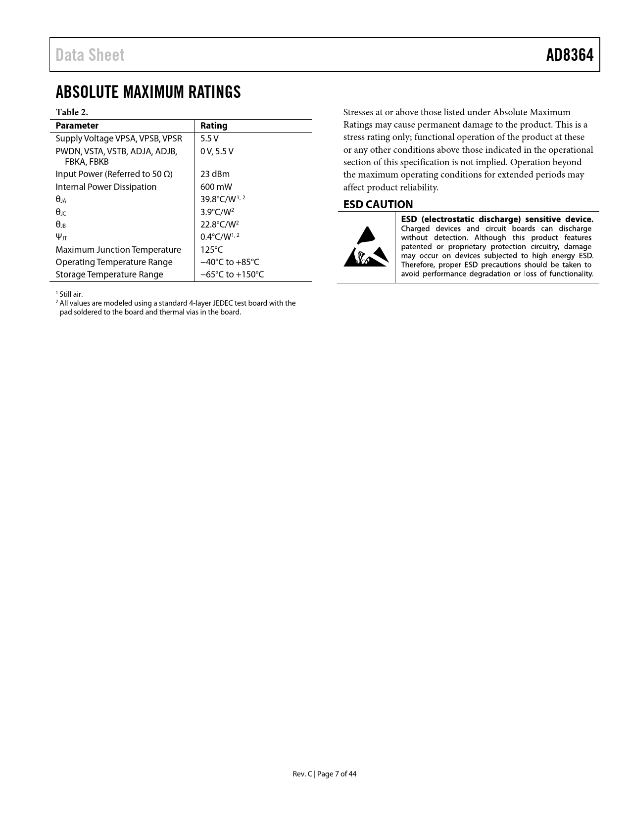 Data Sheet AD8364 ABSOLUTE MAXIMUM RATINGS Table 2 Parameter Rating ESD CAUTION