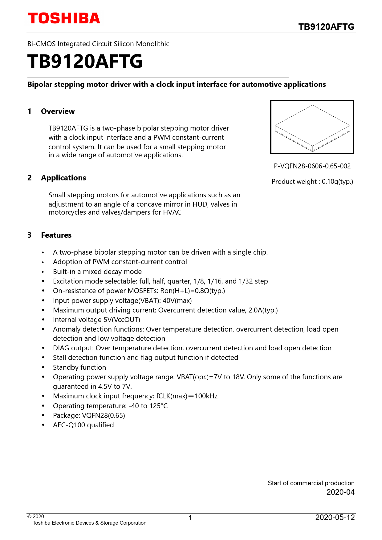 A two-phase bipolar stepping motor can be driven with a single chip. Adoption of PWM constant-current control Built-in a mixed decay mode Excitation mode selectable: full, half, quarter, 1/8, 1/16, and 1/32 step On-resistance of power MOSFETs: Ron(H+L)=0.8Ω(typ.) Input power supply voltage(VBAT): 40V(max) Maximum output driving current: Overcurrent detection value, 2.0A(typ.) Internal voltage 5V(VccOUT) Anomaly detection functions: Over temperature detection, overcurrent detection, load open detection and low voltage detection DIAG output: Over temperature detection, overcurrent detection and load open detection Stal detection function and flag output function if detected Standby function Operating power supply voltage range: VBAT(opr.)=7V to 18V. Only some of the functions are guaranteed in 4.5V to 7V. Maximum clock input frequency: fCLK(max)=100kHz Operating temperature: -40 to 125°C Package: VQFN28(0.65) AEC-Q100 qualified Start of commercial production 2020-04 © 2020 2020-05-12 Toshiba Electronic Devices & Storage Corporation 1