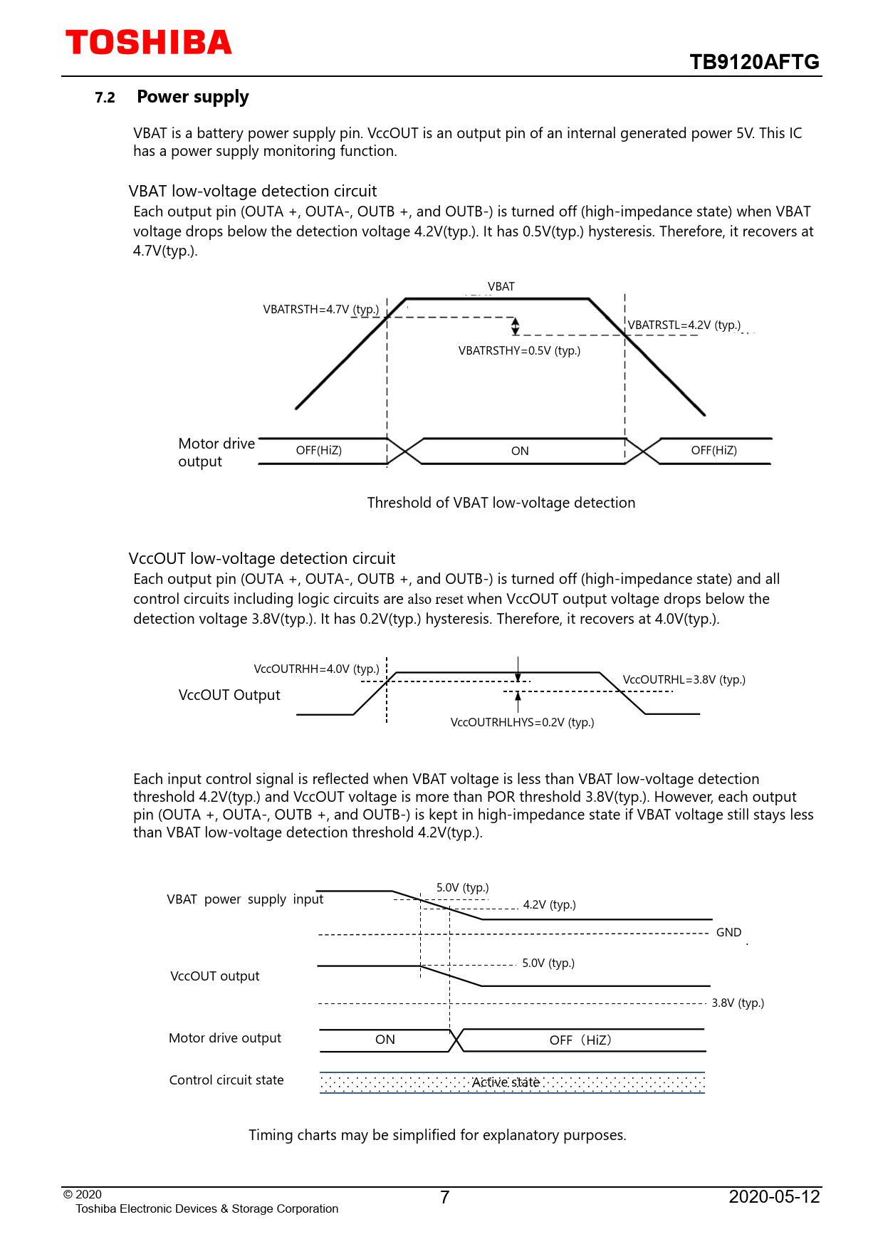 VBAT is a battery power supply pin. VccOUT is an output pin of an internal generated power 5V. This IC has a power supply monitoring function. VBAT low-voltage detection circuit Each output pin (OUTA +, OUTA-, OUTB +, and OUTB-) is turned off (high-impedance state) when VBAT voltage drops below the detection voltage 4.2V(typ.). It has 0.5V(typ.) hysteresis. Therefore, it recovers at 4.7V(typ.). VBAT VBATRSTH=4.7V (typ.) VBATRSTL=4.2V (typ.) VBATRSTHY=0.5V (typ.) Motor drive OFF(HiZ) ON OFF(HiZ) output Threshold of VBAT low-voltage detection VccOUT low-voltage detection circuit Each output pin (OUTA +, OUTA-, OUTB +, and OUTB-) is turned off (high-impedance state) and all control circuits including logic circuits are also reset when VccOUT output voltage drops below the detection voltage 3.8V(typ.). It has 0.2V(typ.) hysteresis. Therefore, it recovers at 4.0V(typ.). VccOUTRHH=4.0V (typ.) VccOUTRHL=3.8V (typ.) VccOUT Output VccOUTRHLHYS=0.2V (typ.) Each input control signal is reflected when VBAT voltage is less than VBAT low-voltage detection threshold 4.2V(typ.) and VccOUT voltage is more than POR threshold 3.8V(typ.). However, each output pin (OUTA +, OUTA-, OUTB +, and OUTB-) is kept in high-impedance state if VBAT voltage still stays less than VBAT low-voltage detection threshold 4.2V(typ.). 5.0V (typ.) VBAT power supply input 4.2V (typ.) GND . 5.0V (typ.) VccOUT output 3.8V (typ.) Motor drive output ON OFF(HiZ) Control circuit state Active state Timing charts may be simplified for explanatory purposes. © 2020 7 2020-05-12 Toshiba Electronic Devices & Storage Corporation