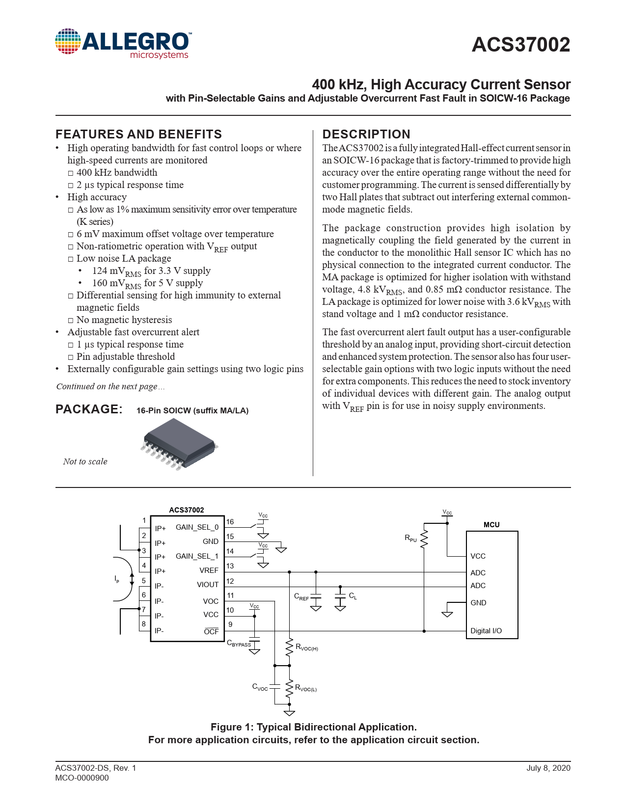 ACS37002 400 kHz, High Accuracy Current Sensor with Pin-Selectable Gains and Adjustable Overcurrent Fast Fault in SOICW-16 Package FEATURES AND BENEFITS DESCRIPTION