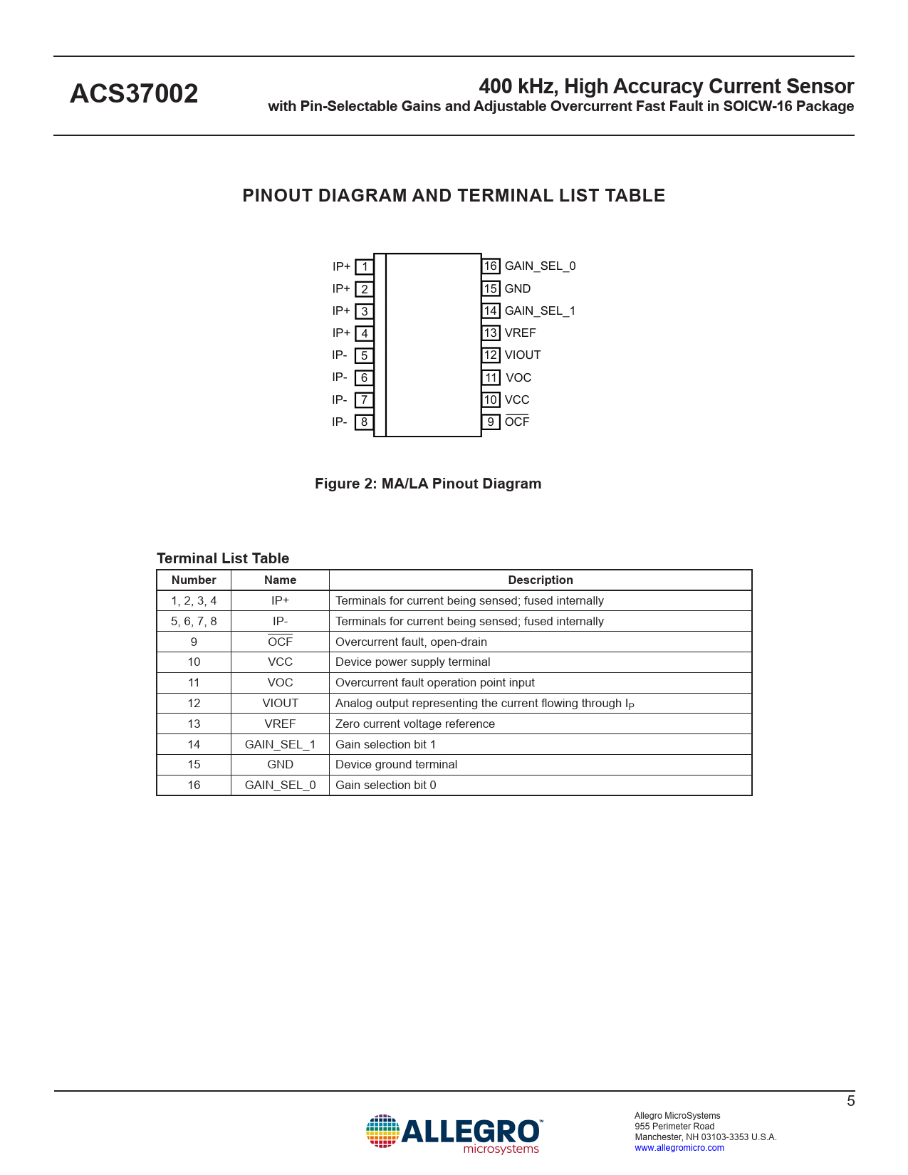 1, 2, 3, 4 IP+ Terminals for current being sensed; fused internally 5, 6, 7, 8 IP- Terminals for current being sensed; fused internally 9 OCF Overcurrent fault, open-drain 10 VCC Device power supply terminal 11 VOC Overcurrent fault operation point input 12 VIOUT Analog output representing the current flowing through IP 13 VREF Zero current voltage reference 14 GAIN_SEL_1 Gain selection bit 1 15 GND Device ground terminal 16 GAIN_SEL_0 Gain selection bit 0 5 Allegro MicroSystems 955 Perimeter Road Manchester, NH 03103-3353 U.S.A. www.allegromicro.com Document Outline Features and Benefits Description Packages Selection guide Absolute Maximum Ratings Isolation Characteristics MA Package Specific Performance LA Package Specific Performance Pinout Diagram and Terminal List Functional Block Diagram Common Electrical Characteristics Performance Characteristics Functional Description Power-On Reset Operation Power-On Power-Off Power-On Timing Power-On Reset (POR) Overvoltage and Undervoltage Detection Undervoltage Detection Voltage Thresholds (VUVD(H/L)) Overvoltage Detection Voltage Thresholds (VOVD(H/L)) Overvoltage/Undervoltage Detection Hysteresis (VOVDHys, VUVDHys) Overvoltage and Undervoltage Enable and Disable Time (tOVD(E/D), tUVD(E/D)) Supply Zener Clamp Voltages Absolute Maximum Ratings Forward and Reverse Supply Voltage Forward and Reverse Output Voltage Forward and Reverse Reference/Fault Voltage Output Source and Sink Current Definitions of Operating and PErformance Characteristics Zero Current Voltage Output (VIOUT(Q), QVO) QVO Temperature Drift (VQE) Reference Voltage (VREF) Reference Voltage Temperature Drift (VRE) Offset Voltage (VOE) Output Saturation Voltage (VSAT(HIGH/LOW)) Sensitivity (Sens) Sensitivity Error (Esens) Gain Selection Pins Full Scale (FS) Nonlinearity (ELIN) Total Output Error (ETOT) Power Supply Offset Error (VPS) Offset Power Supply Rejection Ratio (PSRRO) Power Supply Sensitivity Error (EPS) Sensitivity Power Supply Rejection Ratio (PSRRS) Fault Behavior Overcurrent Fault (OCF) Overcurrent Fault Operating Range/Point (IOCF-OR, IOCF-OP) Overcurrent Fault Hysteresis (IOCF-Hyst) Voltage Overcurrent Pin (VOC) OverCurrent Fault Error (EOCF) OverCurrent Fault Response Time (tOCF) OverCurrent Fault Reaction Time (tOCF-R) OverCurrent Fault Mask Time (tOCF-MASK) OverCurrent Fault Hold Time (tOCF-HOLD) OverCurrent Fault Persist OCF Disable Dynamic Response Parameters Propagation Time (tpd) Rise Time (tR) Response Time (tRESPONSE) Overshoot Settling Time Temperature Compensation Temperature Compensation Update Rate Application and Theory Application Circuits Theory and Functionality – VOC and OCF VOC Driven by Non-Inverting Buffered VREF Power Supply Decoupling Capacitor and Output Capacitive Loads Dynamically Change Gain in a System Thermal Performance Thermal Rise vs. Primary Current Evaluation Board Layout Package Outline Drawings MA Package LA Package