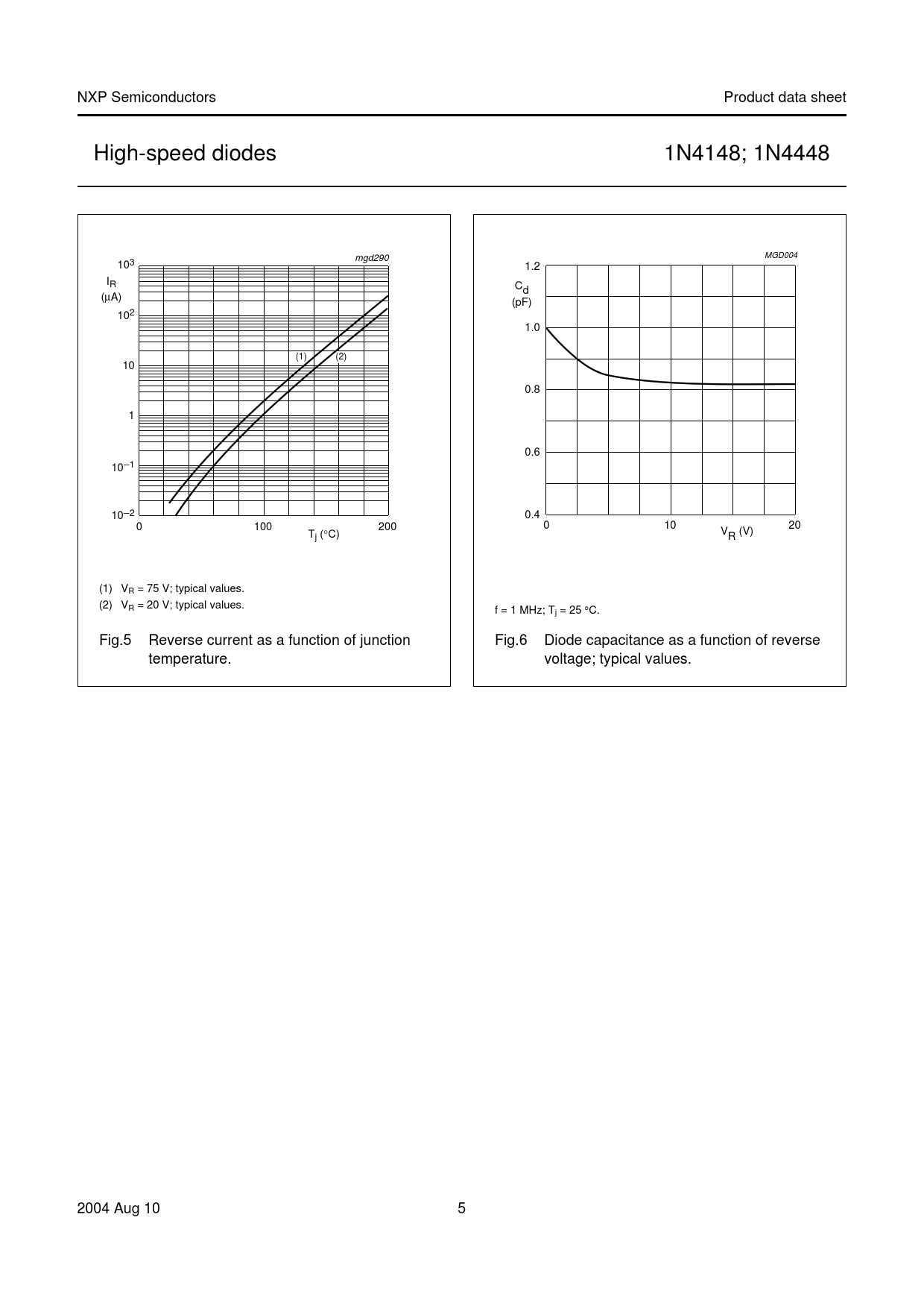 NXP. Semiconductors. Product. data. sheet. High-speed. diodes. 1N4148;. 1N4448. mgd290. MGD004. 103. 1.2. handbook,. halfpage. IR. Cd. (µA). (pF). 102. 1.0. (1)