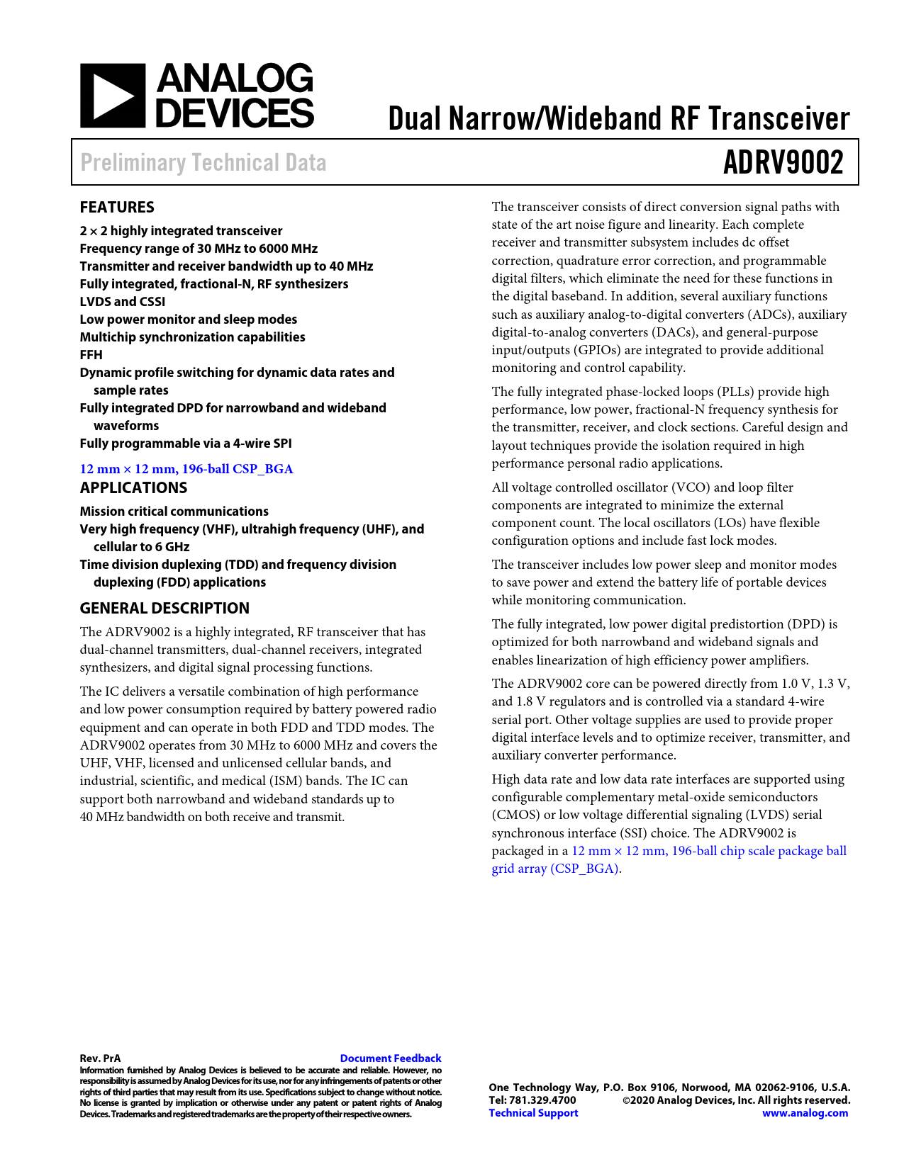 Dual Narrow/Wideband RF Transceiver. Preliminary Technical Data. ADRV9002. FEATURES. 2 × 2 highly integrated transceiver