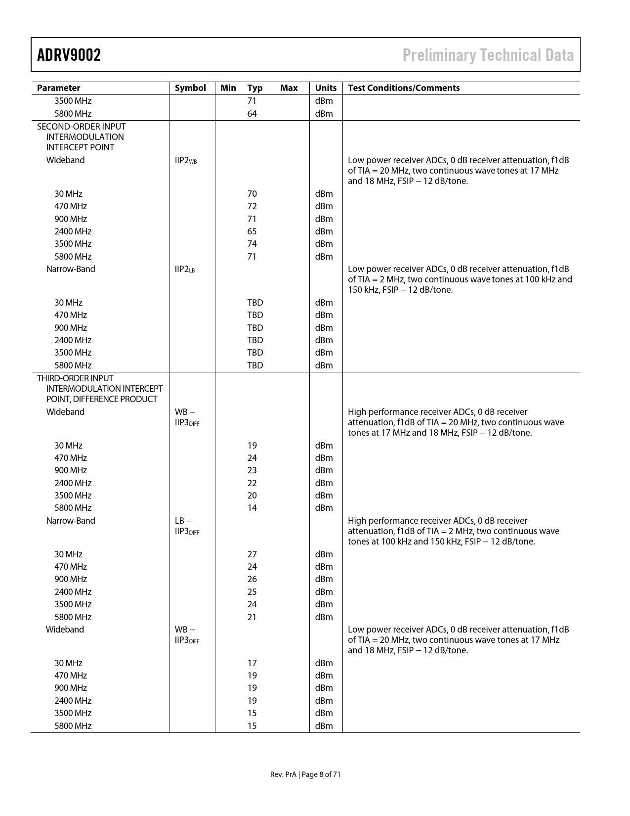 | Pages / Page | 71 / 8 — ADRV9002. Preliminary Technical Data. Parameter. Symbol Min. Typ Max … |