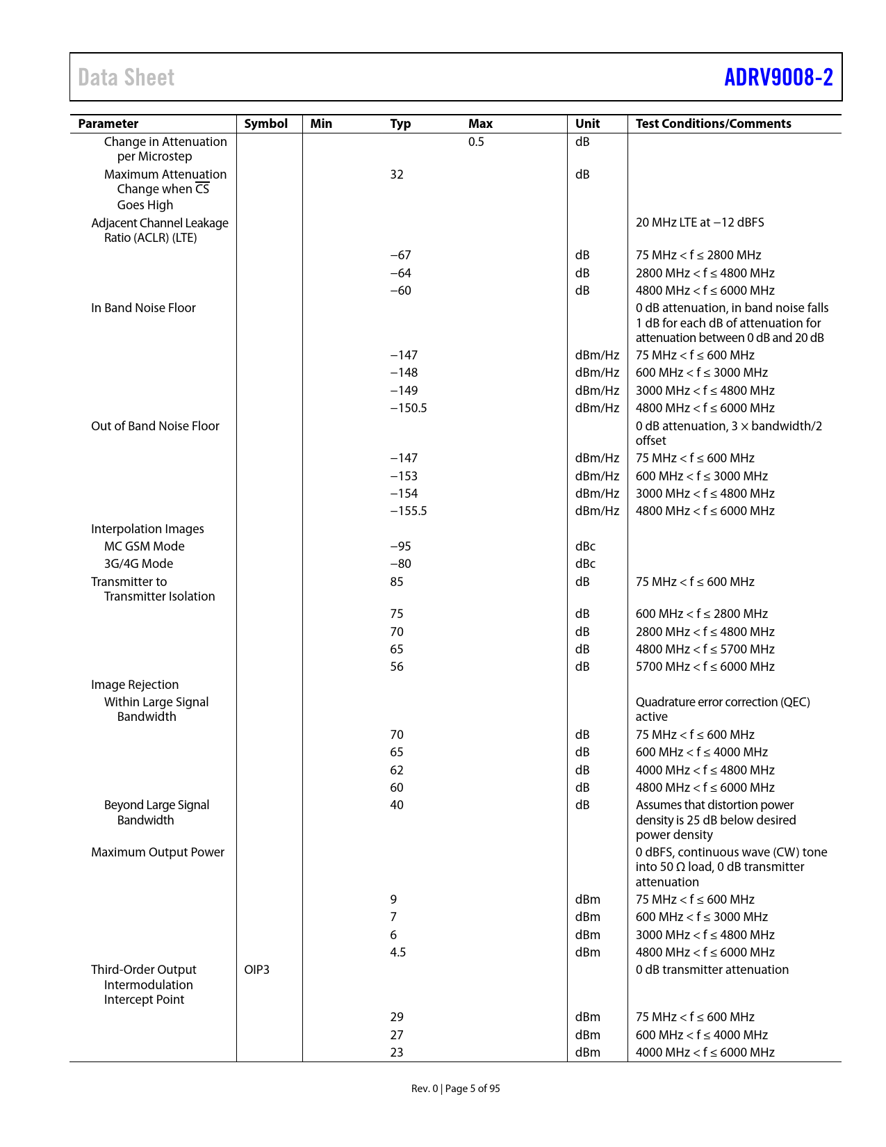 Pages / Page95 / 5 — Data Sheet. ADRV9008-2. Parameter. Symbol. Min. Typ. Max. Unit. Test …