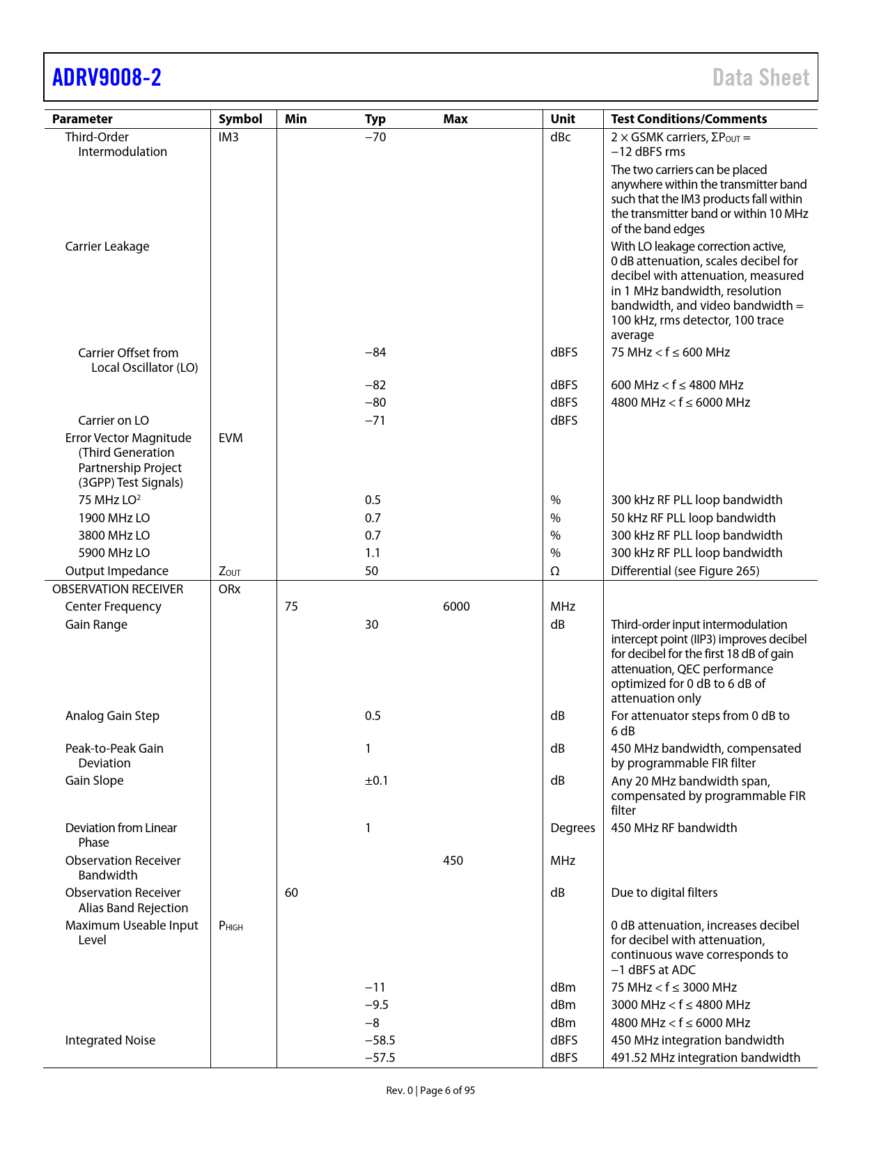 Pages / Page95 / 6 — ADRV9008-2. Data Sheet. Parameter. Symbol. Min. Typ. Max. Unit. Test …