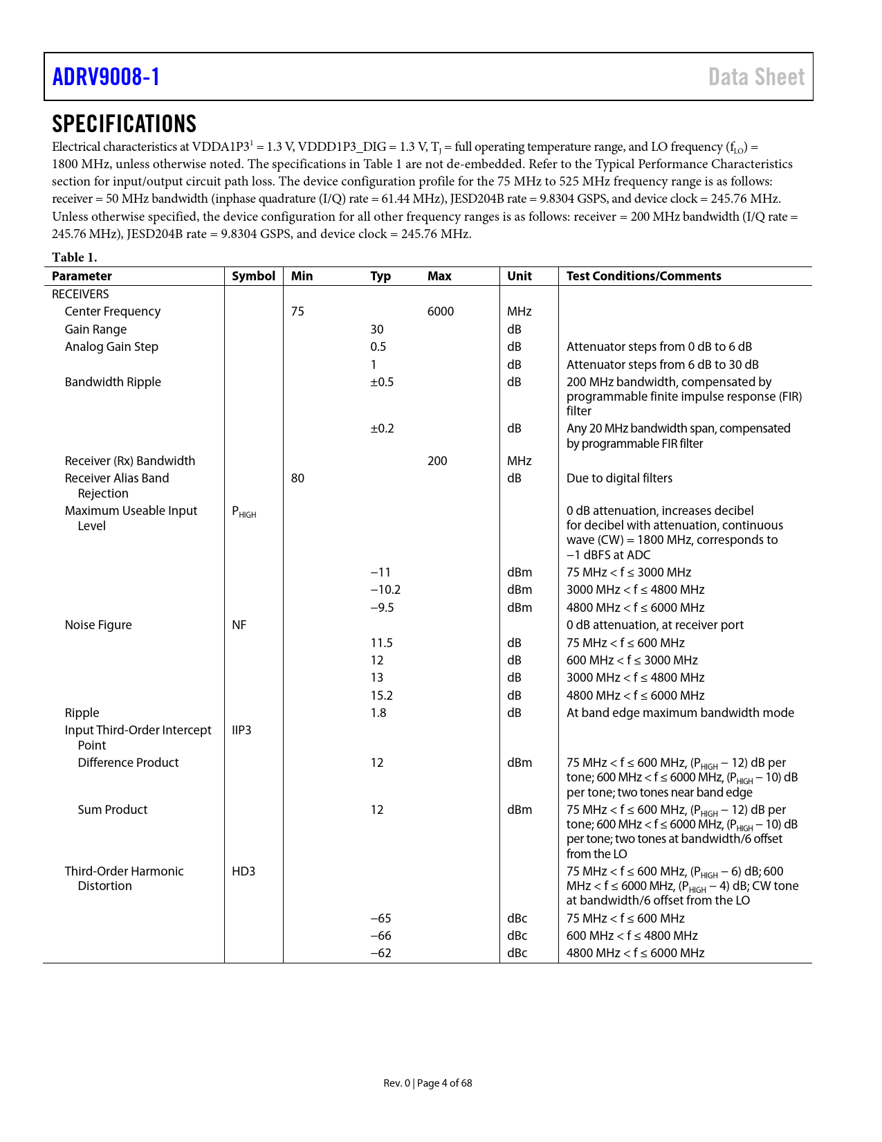 Pages / Page68 / 4 — ADRV9008-1. Data Sheet. SPECIFICATIONS. Table 1. Parameter. Symbol Min. …