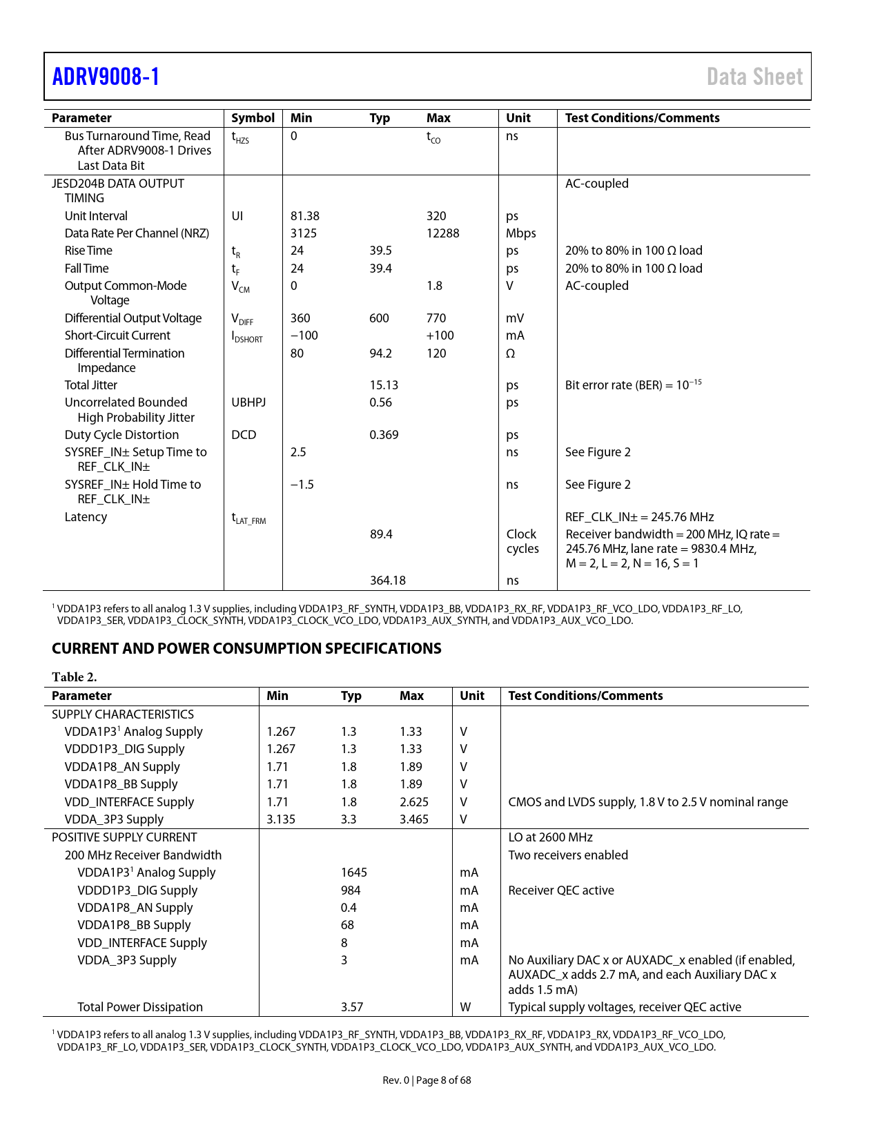 ADRV9008-1. Data Sheet. Parameter. Symbol Min. Typ. Max. Unit. Test Conditions/Comments. CURRENT AND POWER CONSUMPTION SPECIFICATIONS