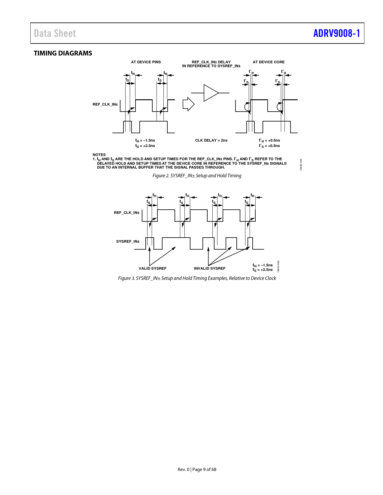 Data Sheet. ADRV9008-1. TIMING DIAGRAMS. AT DEVICE PINS. REF_CLK_IN± DELAY. AT DEVICE CORE. IN REFERENCE TO SYSREF_IN±. t’S