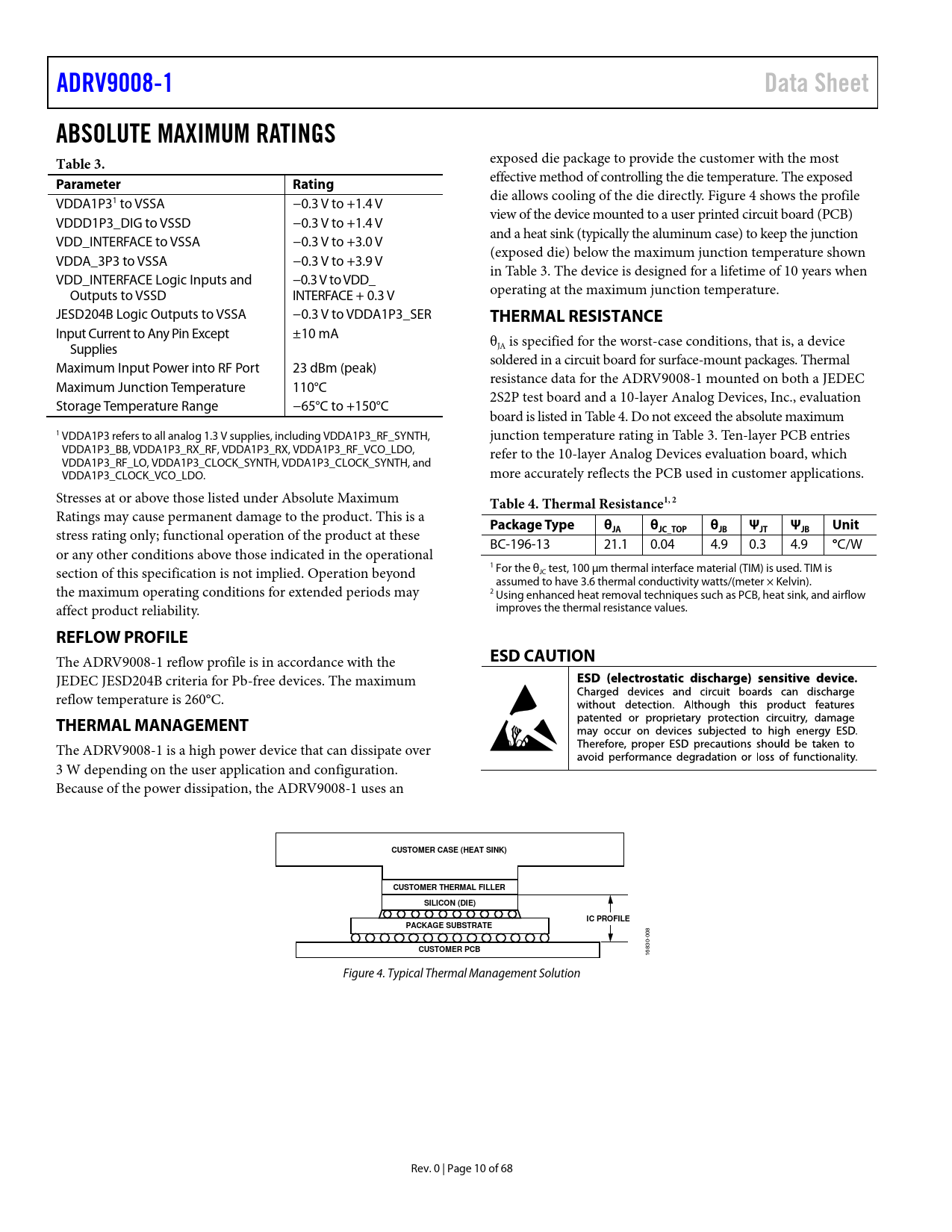 link to page 10 link to page 10 link to page 10 link to page 10 ADRV9008-1Data SheetABSOLUTE MAXIMUM RATINGS Table 3. exposed die package to provide the customer with the most ParameterRating effective method of controlling the die temperature. The exposed die allows cooling of the die directly. Figure 4 shows the profile VDDA1P31 to VSSA −0.3 V to +1.4 V view of the device mounted to a user printed circuit board (PCB) VDDD1P3_DIG to VSSD −0.3 V to +1.4 V and a heat sink (typical y the aluminum case) to keep the junction VDD_INTERFACE to VSSA −0.3 V to +3.0 V (exposed die) below the maximum junction temperature shown VDDA_3P3 to VSSA −0.3 V to +3.9 V in Table 3. The device is designed for a lifetime of 10 years when VDD_INTERFACE Logic Inputs and −0.3 V to VDD_ Outputs to VSSD INTERFACE + 0.3 V operating at the maximum junction temperature. JESD204B Logic Outputs to VSSA −0.3 V to VDDA1P3_SER THERMAL RESISTANCE Input Current to Any Pin Except ±10 mA θ Supplies JA is specified for the worst-case conditions, that is, a device soldered in a circuit board for surface-mount packages. Thermal Maximum Input Power into RF Port 23 dBm (peak) resistance data for the ADRV9008-1 mounted on both a JEDEC Maximum Junction Temperature 110°C 2S2P test board and a 10-layer Analog Devices, Inc., evaluation Storage Temperature Range −65°C to +150°C board is listed in Table 4. Do not exceed the absolute maximum 1 VDDA1P3 refers to all analog 1.3 V supplies, including VDDA1P3_RF_SYNTH, junction temperature rating in Table 3. Ten-layer PCB entries VDDA1P3_BB, VDDA1P3_RX_RF, VDDA1P3_RX, VDDA1P3_RF_VCO_LDO, refer to the 10-layer Analog Devices evaluation board, which VDDA1P3_RF_LO, VDDA1P3_CLOCK_SYNTH, VDDA1P3_CLOCK_SYNTH, and VDDA1P3_CLOCK_VCO_LDO. more accurately reflects the PCB used in customer applications. Stresses at or above those listed under Absolute Maximum Table 4. Thermal Resistance1, 2 Ratings may cause permanent damage to the product. This is a Package TypeθθθΨΨUnit stress rating only; functional operation of the product at these JAJC_TOPJBJTJB BC-196-13 21.1 0.04 4.9 0.3 4.9 ° C/W or any other conditions above those indicated in the operational section of this specification is not implied. Operation beyond 1 For the θJC test, 100 µm thermal interface material (TIM) is used. TIM is assumed to have 3.6 thermal conductivity watts/(meter × Kelvin). the maximum operating conditions for extended periods may 2 Using enhanced heat removal techniques such as PCB, heat sink, and airflow affect product reliability. improves the thermal resistance values. REFLOW PROFILE The ADRV9008-1 reflow profile is in accordance with the ESD CAUTION JEDEC JESD204B criteria for Pb-free devices. The maximum reflow temperature is 260°C. THERMAL MANAGEMENT The ADRV9008-1 is a high power device that can dissipate over 3 W depending on the user application and configuration. Because of the power dissipation, the ADRV9008-1 uses an CUSTOMER CASE (HEAT SINK)CUSTOMER THERMAL FILLERSILICON (DIE)IC PROFILEPACKAGE SUBSTRATE 008 CUSTOMER PCB 16830- Figure 4. Typical Thermal Management Solution Rev. 0 | Page 10 of 68 Document Outline Features Applications General Description Revision History Functional Block Diagram Specifications Current and Power Consumption Specifications Timing Diagrams Absolute Maximum Ratings Reflow Profile Thermal Management Thermal Resistance ESD Caution Pin Configuration and Function Descriptions Typical Performance Characteristics 75 MHz to 525 MHz Band 650 MHz to 3000 MHz Band 3400 MHz to 4800 MHz Band 5100 MHz to 5900 MHz Band Receiver Input Impedance Terminology Theory of Operation Receivers Clock Input Synthesizers RF PLL Clock PLL SPI JTAG Boundary Scan Power Supply Sequence GPIO_x Pins Auxiliary Converters AUXADC_x Auxiliary DAC x JESD204B Data Interface Applications Information PCB Layout and Power Supply Recommendations Overview PCB Material and Stackup Selection Fanout and Trace Space Guidelines Component Placement and Routing Guidelines Signals with Highest Routing Priority Signals with Second Routing Priority Signals with Lowest Routing Priority RF and JESD204B Transmission Line Layout RF Routing Guidelines JESD204B Trace Routing Recommendations Routing Recommendations Stripline Transmission Lines vs. Microstrip Transmission Lines Isolation Techniques Used on the ADRV9008-1W/PCBZ Isolation Goals Isolation Between JESD204B Lines RF Port Interface Information RF Port Impedance Data Advanced Design System (ADS) Setup Using the DataAccessComponent and SEDZ File General Receiver Path Interface Impedance Matching Network Examples Outline Dimensions Ordering Guide