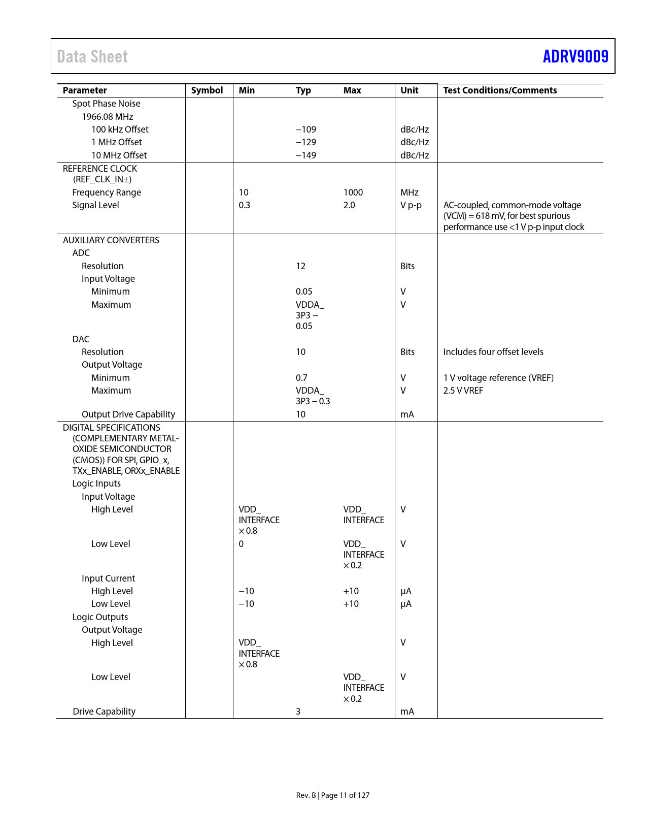 Pages / Page127 / 11 — Data Sheet. ADRV9009. Parameter Symbol. Min. Typ. Max. Unit. Test. …