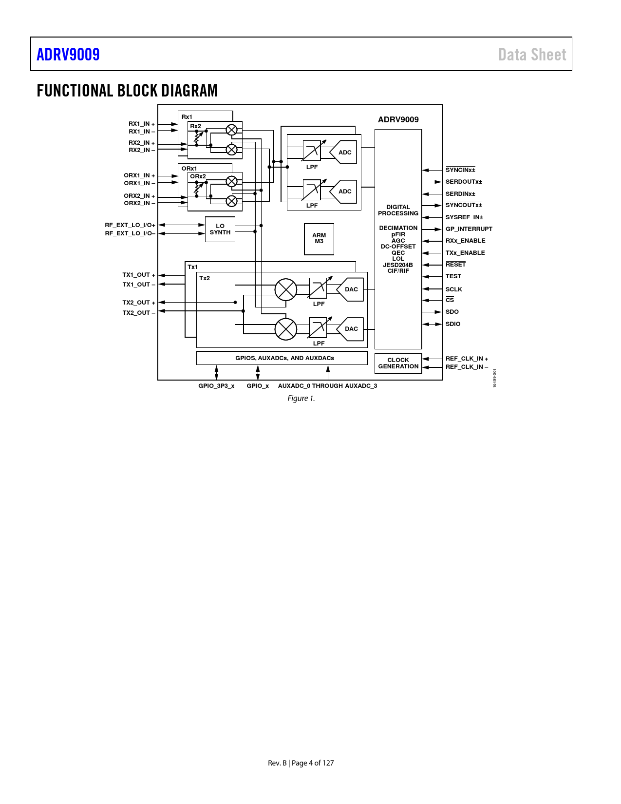 ADRV9009Data SheetFUNCTIONAL BLOCK DIAGRAMRx1ADRV9009RX1_IN +Rx2RX1_IN –RX2_IN + RX2_IN –ADCLPFORx1SYNCINx±ORX1_IN +ORx2ORX1_IN –SERDOUTx±ADCORX2_IN +SERDINx±ORX2_IN –LPFSYNCOUTx±DIGITALPROCESSINGSYSREF_IN±RF_EXT_LO_I/O+LODECIMATIONGP_INTERRUPTRF_EXT_LO_I/O–SYNTHARMpFIRM3AGCRXx_ENABLEDC-OFFSETQECTXx_ENABLELOLJESD204BRESETTx1CIF/RIFTX1_OUT +TESTTx2TX1_OUT –DACSCLKTX2_OUT +CSLPFTX2_OUT –SDOSDIODACLPFGPIOS, AUXADCs, AND AUXDACsCLOCKREF_CLK_IN +GENERATIONREF_CLK_IN – 001 GPIO_3P3_xGPIO_xAUXADC_0 THROUGH AUXADC_3 16499- Figure 1. Rev. B | Page 4 of 127 Document Outline Features Applications General Description Revision History Functional Block Diagram Specifications Current and Power Consumption Specifications Timing Diagrams Absolute Maximum Ratings Reflow Profile Thermal Management Thermal Resistance ESD Caution Pin Configuration and Function Descriptions Typical Performance Characteristics 75 MHz to 525 MHz Band 650 MHz to 3000 MHz Band 3400 MHz to 4800 MHz Band 5100 MHz to 5900 MHz Band Transmitter Output Impedance Observation Receiver Input Impedance Receiver Input Impedance Terminology Theory of Operation Transmitter Receiver Observation Receiver Clock Input Synthesizers RF PLL Clock PLL SPI JTAG Boundary Scan Power Supply Sequence GPIO_x Pins Auxiliary Converters AUXADC_x Auxiliary DAC x JESD204B Data Interface Applications Information PCB Layout and Power Supply Recommendations Overview PCB Material and Stackup Selection Fanout and Trace Space Guidelines Component Placement and Routing Guidelines Signals with Highest Routing Priority Signals with Second Routing Priority Signals with Lowest Routing Priority RF and JESD204B Transmission Line Layout RF Routing Guidelines Transmitter Balun DC Feed Supplies JESD204B Trace Routing Recommendations Routing Recommendations Stripline Transmission Lines vs. Microstrip Transmission Lines Isolation Techniques Used on the ADRV9009-W/PCBZ Isolation Goals Isolation Between JESD204B Lines RF Port Interface Information RF Port Impedance Data Advanced Design System (ADS) Setup Using the DataAccessComponent and SEDZ File Transmitter Bias and Port Interface General Receiver Path Interface Impedance Matching Network Examples Outline Dimensions Ordering Guide