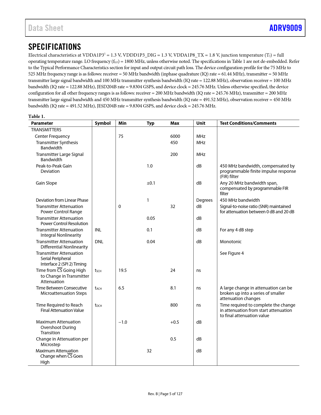 Pages / Page127 / 5 — Data Sheet. ADRV9009. SPECIFICATIONS. Table 1. Parameter Symbol. Min. …