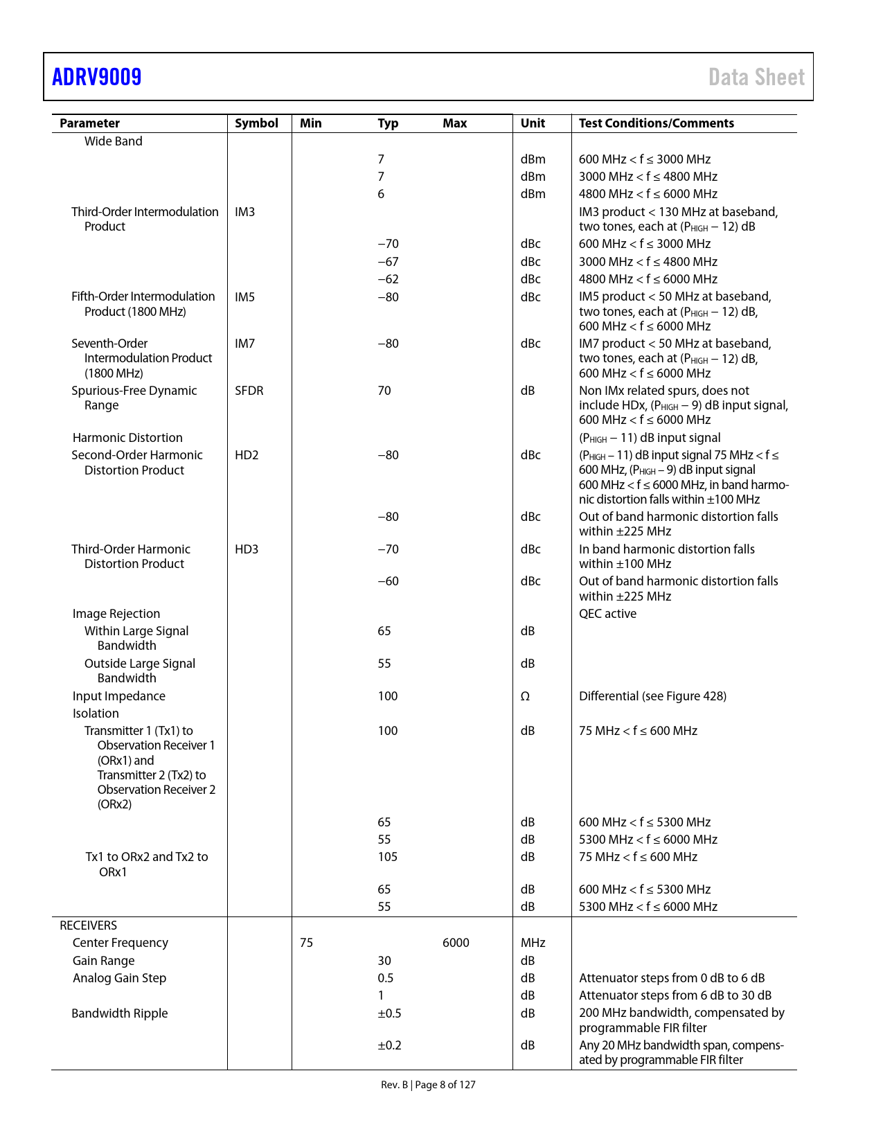 Pages / Page127 / 8 — ADRV9009. Data Sheet. Parameter Symbol. Min. Typ. Max. Unit. Test. …