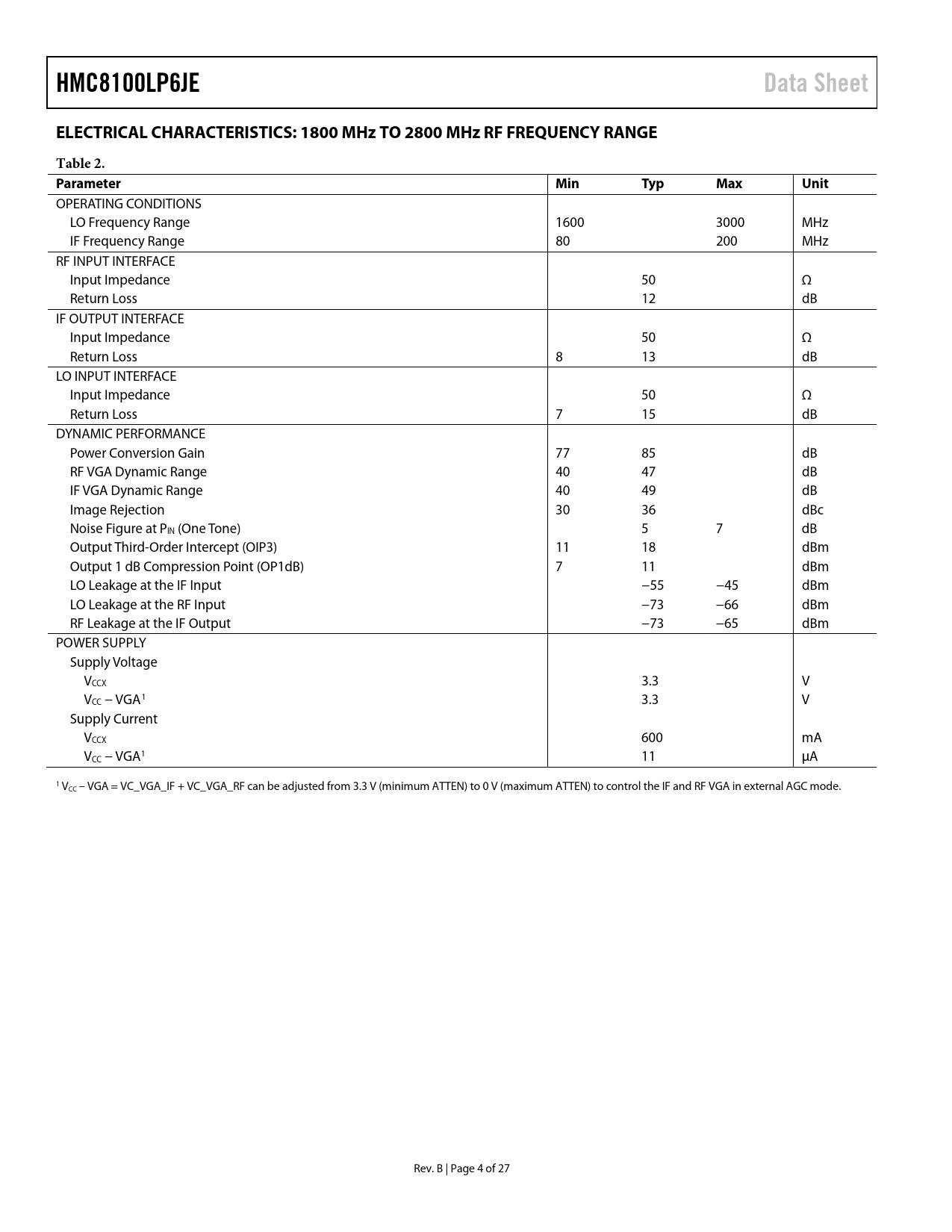 HMC8100LP6JE. Data Sheet. ELECTRICAL CHARACTERISTICS: 1800 MHz TO 2800 MHz RF FREQUENCY RANGE. Table 2. Parameter. Min. Typ. Max