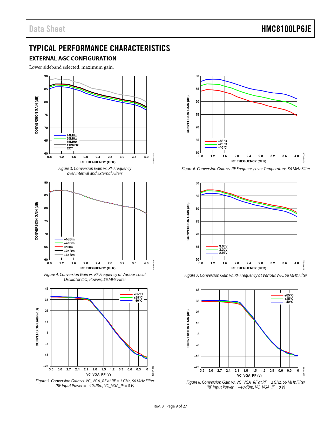 Data SheetHMC8100LP6JETYPICAL PERFORMANCE CHARACTERISTICS EXTERNAL AGC CONFIGURATION Lower sideband selected, maximum gain. 90908585)B)B(d80(d80NINAIAGGNN7575IOO SIRS EVERNV70N70OCOC14MHz 28MHz656556MHz+85°C112MHz+25°CEXT–40°C6060 03 006 0.81.21.62.02.42.83.23.64.0 0 0.81.21.62.02.42.83.23.64.0 7- 86 RF FREQUENCY (GHz)RF FREQUENCY (GHz) 13 13867- Figure 3. Conversion Gain vs. RF Frequency Figure 6. Conversion Gain vs. RF Frequency over Temperature, 56 MHz Filter over Internal and External Filters 90908585)B)B(d80(d80NINAIAGGN75N75IOO SIRS EVERNV70N70OCO–4dBmC–2dBm650dBm653.63V+2dBm3.30V 2.97V+4dBm6060 04 0.81.21.62.02.42.83.23.64.0 0 0.81.21.62.02.42.83.23.64.0 007 7- 86 RF FREQUENCY (GHz) 13 RF FREQUENCY (GHz) 13867- Figure 4. Conversion Gain vs. RF Frequency at Various Local Figure 7. Conversion Gain vs. RF Frequency at Various VCCx, 56 MHz Filter Oscillator (LO) Powers, 56 MHz Filter 4545+85°C+85°C+25°C35+25°C–40°C35–40°CB)25)dB25dN ((AIIN1515N GGAIOION5RSS5ER ENVV–5COON–5C–15–15–25 05 –25 8 3.33.02.72.42.11.81.51.20.90.60.30 0 7- 3.33.02.72.42.11.81.51.20.90.60.30 00 7- 86 VC_VGA_RF (V) 86 13 VC_VGA_RF (V) 13 Figure 5. Conversion Gain vs. VC_VGA_RF at RF = 1 GHz, 56 MHz Filter Figure 8. Conversion Gain vs. VC_VGA_RF at RF = 2 GHz, 56 MHz Filter (RF Input Power = −40 dBm, VC_VGA_IF = 0 V) (RF Input Power = −40 dBm, VC_VGA_IF = 0 V) Rev. B | Page 9 of 27 Document Outline FEATURES APPLICATIONS GENERAL DESCRIPTION FUNCTIONAL BLOCK DIAGRAM REVISION HISTORY SPECIFICATIONS ELECTRICAL CHARACTERISTICS: 800 MHz TO 1800 MHz RF FREQUENCY RANGE ELECTRICAL CHARACTERISTICS: 1800 MHz TO 2800 MHz RF FREQUENCY RANGE ELECTRICAL CHARACTERISTICS: 2800 MHz TO 4000 MHz RF FREQUENCY RANGE ABSOLUTE MAXIMUM RATINGS ESD CAUTION PIN CONFIGURATION AND FUNCTION DESCRIPTIONS TYPICAL PERFORMANCE CHARACTERISTICS EXTERNAL AGC CONFIGURATION INTERNAL AGC CONFIGURATION THEORY OF OPERATION REGISTER ARRAY ASSIGNMENTS AND SERIAL INTERFACE Read Example REGISTER DESCRIPTIONS REGISTER ARRAY ASSIGNMENTS Enable Bits Image Reject and Band-Pass Filter Bits Band-Pass Filter Bits: OTP and SPI AGC AGC: IF Gain Limit Bits Band-Pass Filter Bits: Calibration and 8-Bit Word Frequency AGC: Blocker Power Detector Bits Phase I Bits Phase Q Bits APPLICATIONS INFORMATION SCHEMATIC/TYPICAL APPLICATION CIRCUIT EVALUATION PRINTED CIRCUIT BOARD (PCB) OUTLINE DIMENSIONS ORDERING GUIDE