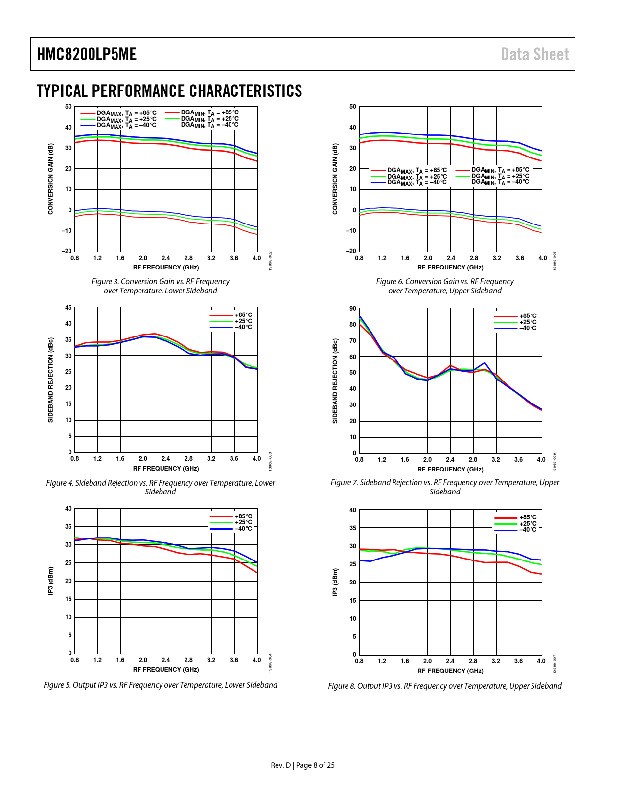 13868- Figure 4. Sideband Rejection vs. RF Frequency over Temperature, Lower Figure 7. Sideband Rejection vs. RF Frequency over Temperature, Upper Sideband Sideband