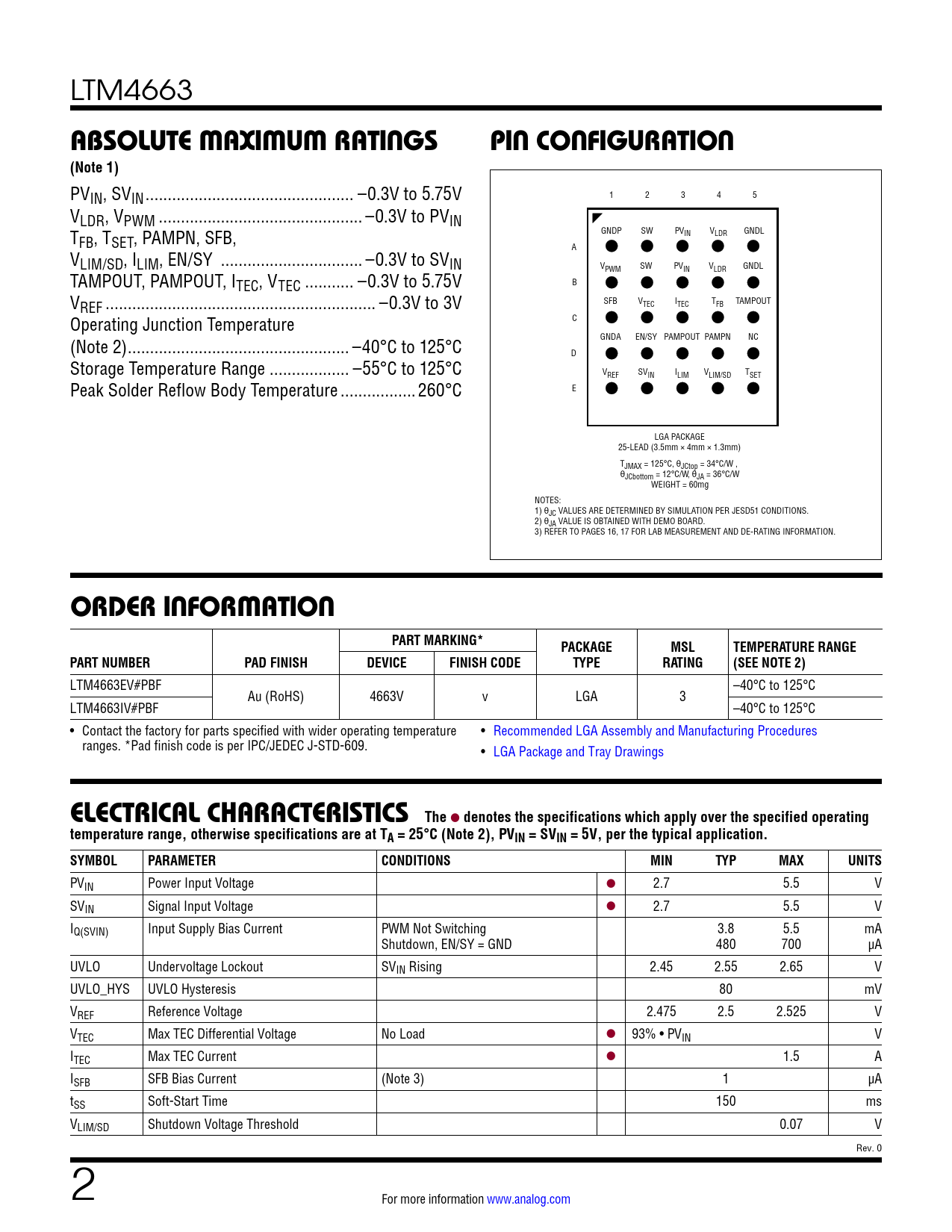 LTM4663 ABSOLUTE MAXIMUM RATINGSPIN CONFIGURATION(Note 1) TOP VIEW PVIN, SVIN ... –0.3V to 5.75V 1 2 3 4 5 VLDR, VPWM .. –0.3V to PVIN T GNDP SW PV FB, TSET, PAMPN, SFB, IN VLDR GNDL A VLIM/SD, ILIM, EN/SY .. –0.3V to SVIN VPWM SW PVIN VLDR GNDL TAMPOUT, PAMPOUT, ITEC, VTEC ... –0.3V to 5.75V B VREF ... –0.3V to 3V SFB VTEC ITEC TFB TAMPOUT Operating Junction Temperature C (Note 2) .. –40°C to 125°C GNDA EN/SY PAMPOUT PAMPN NC D Storage Temperature Range .. –55°C to 125°C VREF SVIN ILIM VLIM/SD TSET Peak Solder Reflow Body Temperature ...260°C E LGA PACKAGE 25-LEAD (3.5mm × 4mm × 1.3mm) TJMAX = 125°C, θJCtop = 34°C/W , θJCbottom = 12°C/W, θJA = 36°C/W WEIGHT = 60mg NOTES: 1) θJC VALUES ARE DETERMINED BY SIMULATION PER JESD51 CONDITIONS. 2) θJA VALUE IS OBTAINED WITH DEMO BOARD. 3) REFER TO PAGES 16, 17 FOR LAB MEASUREMENT AND DE-RATING INFORMATION. ORDER INFORMATIONPART MARKING*PACKAGEMSLTEMPERATURE RANGEPART NUMBERPAD FINISHDEVICEFINISH CODETYPERATING(SEE NOTE 2) LTM4663EV#PBF –40°C to 125°C Au (RoHS) 4663V v LGA 3 LTM4663IV#PBF –40°C to 125°C • Contact the factory for parts specified with wider operating temperature • Recommended LGA Assembly and Manufacturing Procedures ranges. *Pad finish code is per IPC/JEDEC J-STD-609. • LGA Package and Tray Drawings ELECTRICAL CHARACTERISTICSThe l denotes the specifications which apply over the specified operatingtemperature range, otherwise specifications are at TA = 25°C (Note 2), PVIN = SVIN = 5V, per the typical application. SYMBOLPARAMETERCONDITIONSMINTYPMAXUNITS PVIN Power Input Voltage l 2.7 5.5 V SVIN Signal Input Voltage l 2.7 5.5 V IQ(SVIN) Input Supply Bias Current PWM Not Switching 3.8 5.5 mA Shutdown, EN/SY = GND 480 700 µA UVLO Undervoltage Lockout SVIN Rising 2.45 2.55 2.65 V UVLO_HYS UVLO Hysteresis 80 mV VREF Reference Voltage 2.475 2.5 2.525 V VTEC Max TEC Differential Voltage No Load l 93% • PVIN V ITEC Max TEC Current l 1.5 A ISFB SFB Bias Current (Note 3) 1 µA tSS Soft-Start Time 150 ms VLIM/SD Shutdown Voltage Threshold 0.07 V Rev. 0 2 For more information www.analog.com Document Outline Features Applications Typical Application Description Absolute Maximum Ratings Order Information Electrical Characteristics Pin Configuration Typical Performance Characteristics Pin Functions Block Diagram Decoupling Requirements Operation Applications Information Typical Applications Package Description Package Photo Package Description Design Resources Related Parts