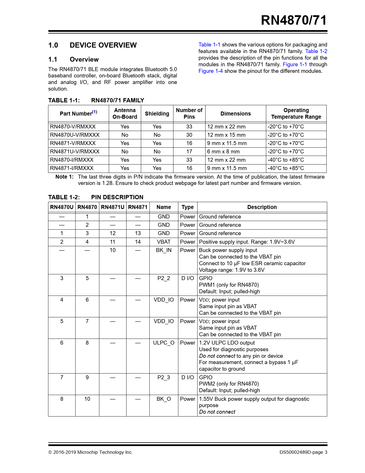 Pages / Page51 / 3 — RN4870/71. 1.0. DEVICE OVERVIEW. 1.1. Overview. TABLE 1-1:. RN4870/71 …