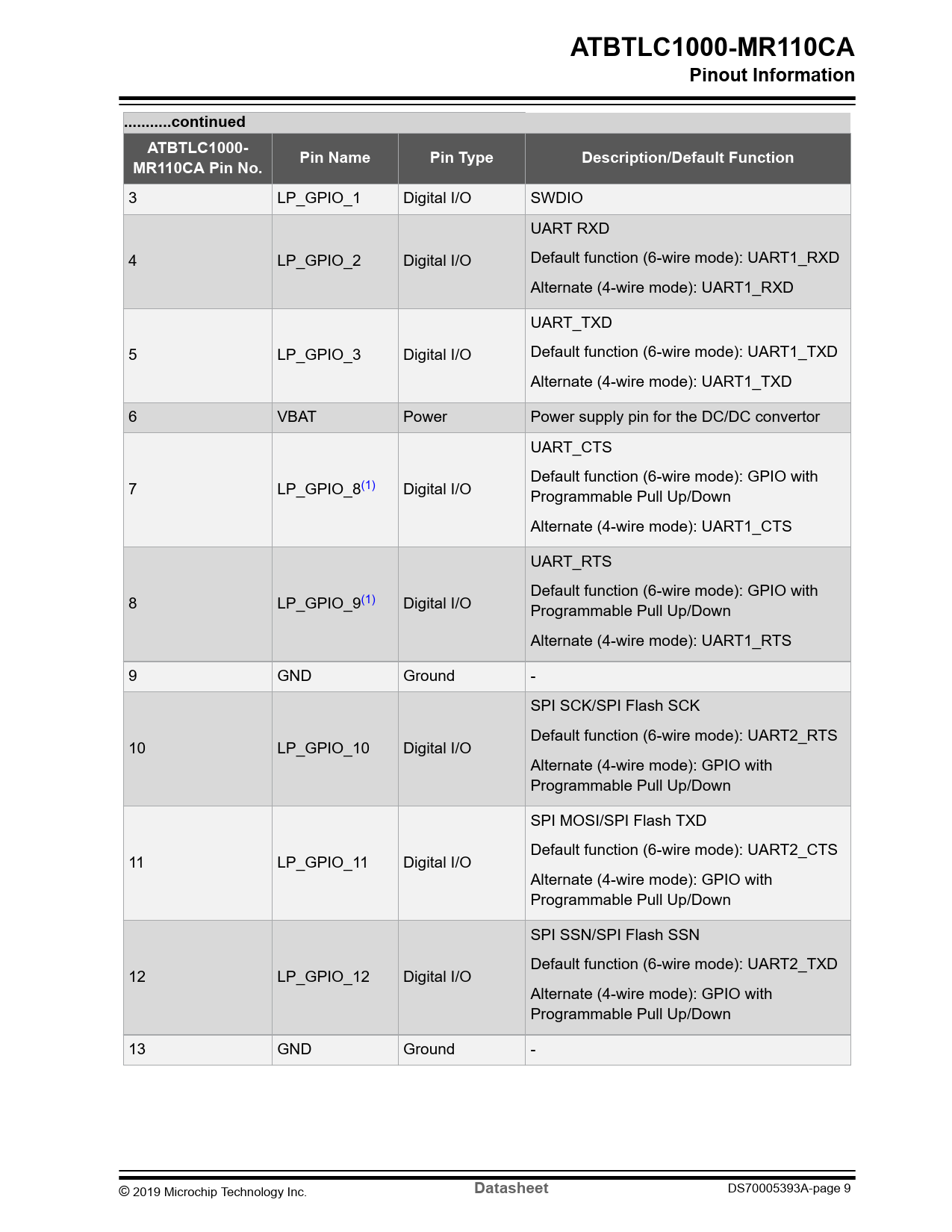 3 LP_GPIO_1 Digital I/O SWDIO UART RXD 4 LP_GPIO_2 Digital I/O Default function (6-wire mode): UART1_RXD Alternate (4-wire mode): UART1_RXD UART_TXD 5 LP_GPIO_3 Digital I/O Default function (6-wire mode): UART1_TXD Alternate (4-wire mode): UART1_TXD 6 VBAT Power Power supply pin for the DC/DC convertor UART_CTS Default function (6-wire mode): GPIO with 7 LP_GPIO_8(1) Digital I/O Programmable Pull Up/Down Alternate (4-wire mode): UART1_CTS UART_RTS Default function (6-wire mode): GPIO with 8 LP_GPIO_9(1) Digital I/O Programmable Pull Up/Down Alternate (4-wire mode): UART1_RTS 9 GND Ground - SPI SCK/SPI Flash SCK Default function (6-wire mode): UART2_RTS 10 LP_GPIO_10 Digital I/O Alternate (4-wire mode): GPIO with Programmable Pull Up/Down SPI MOSI/SPI Flash TXD Default function (6-wire mode): UART2_CTS 11 LP_GPIO_11 Digital I/O Alternate (4-wire mode): GPIO with Programmable Pull Up/Down SPI SSN/SPI Flash SSN Default function (6-wire mode): UART2_TXD 12 LP_GPIO_12 Digital I/O Alternate (4-wire mode): GPIO with Programmable Pull Up/Down 13 GND Ground - © 2019 Microchip Technology Inc.