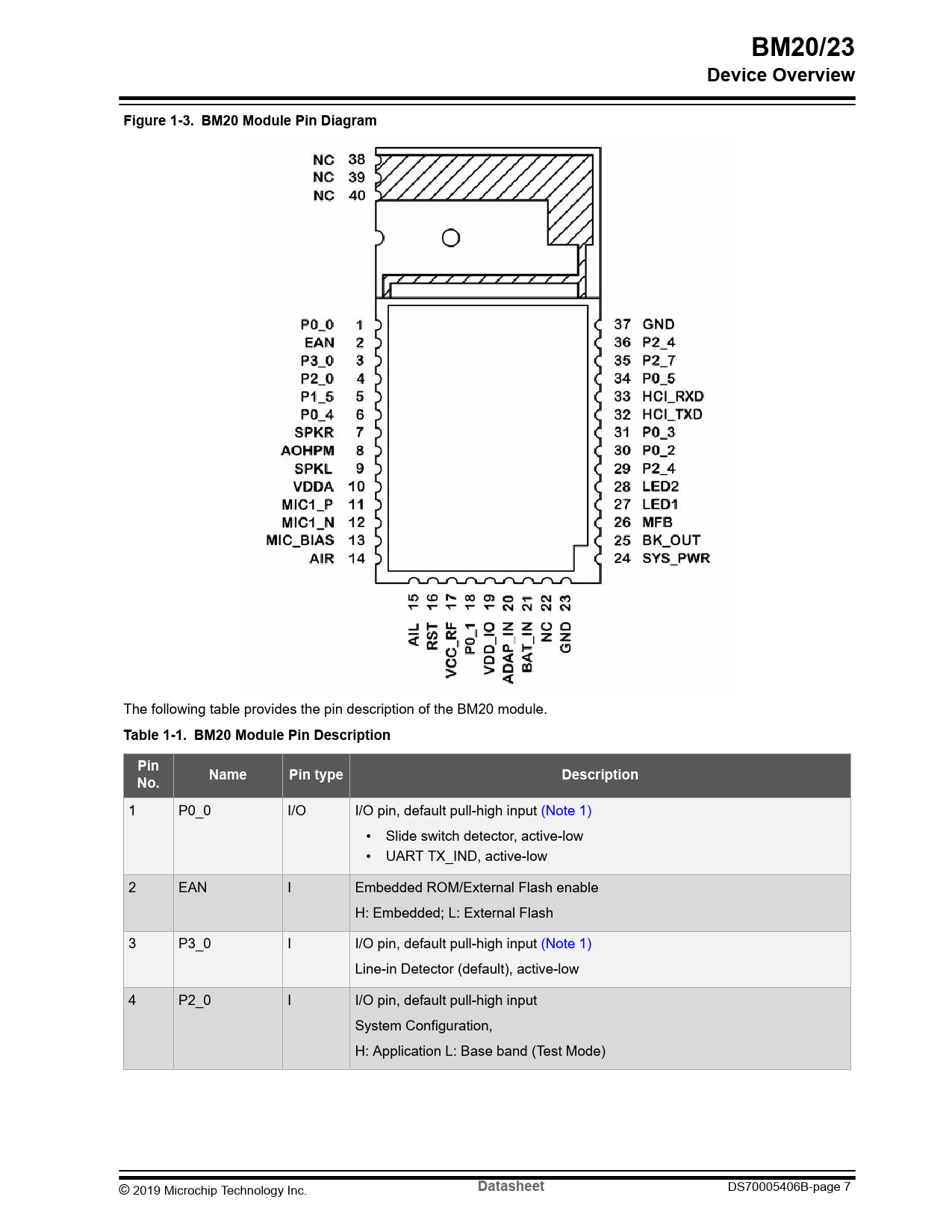 | Pages / Page | 54 / 7 — BM20/23. Device Overview. Figure 1-3. BM20 Module Pin Diagram. Table … |