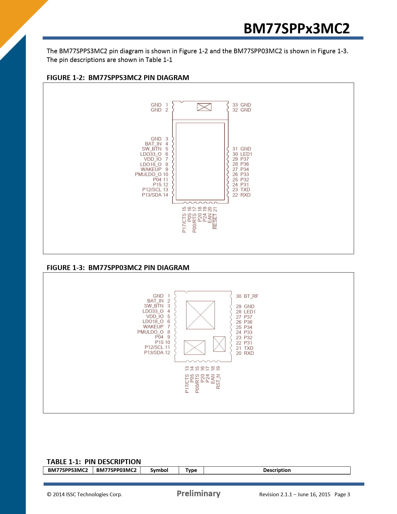 BM77SPPS3MC2 BM77SPP03MC2 © 2014 ISSC Technologies Corp. Symbol Type Preliminary Description Revision 2.1.1 – June 16, 2015 Page 3