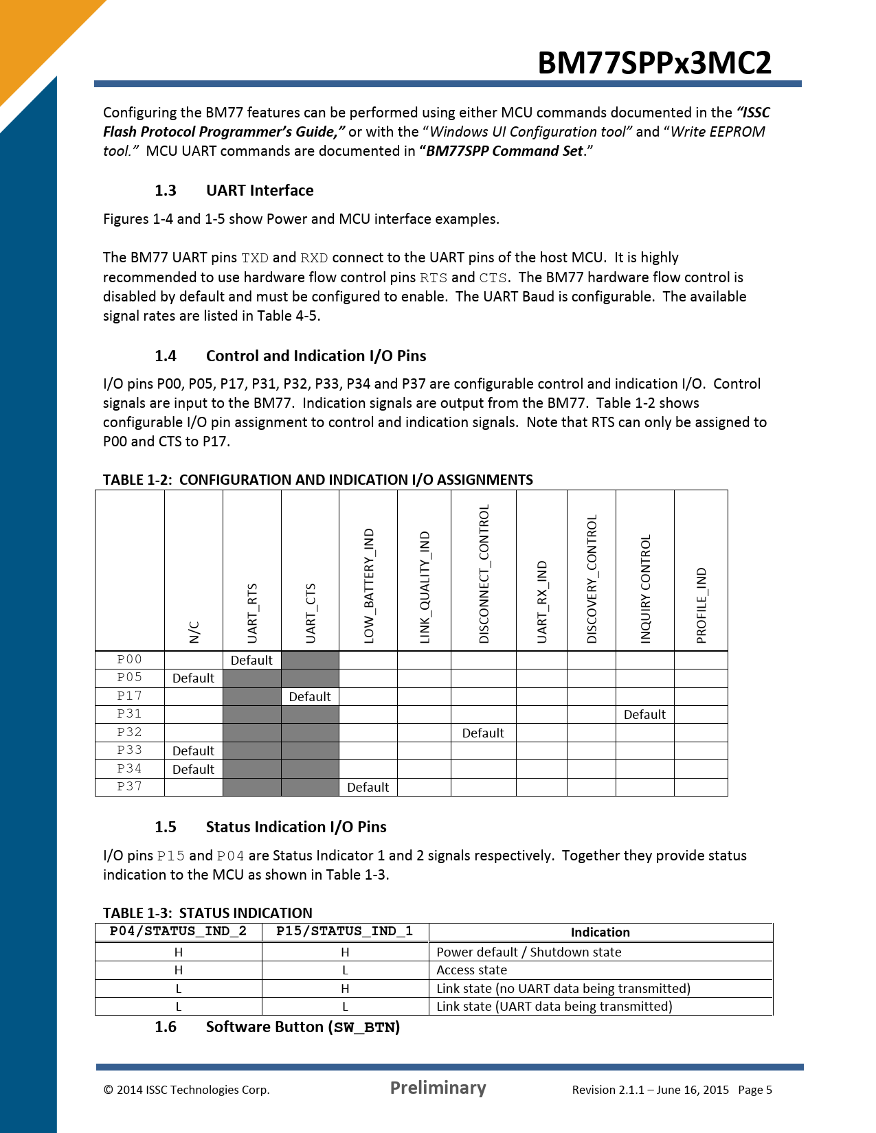 Link state (UART data being transmitted) Preliminary Revision 2.1.1 – June 16, 2015 Page 5