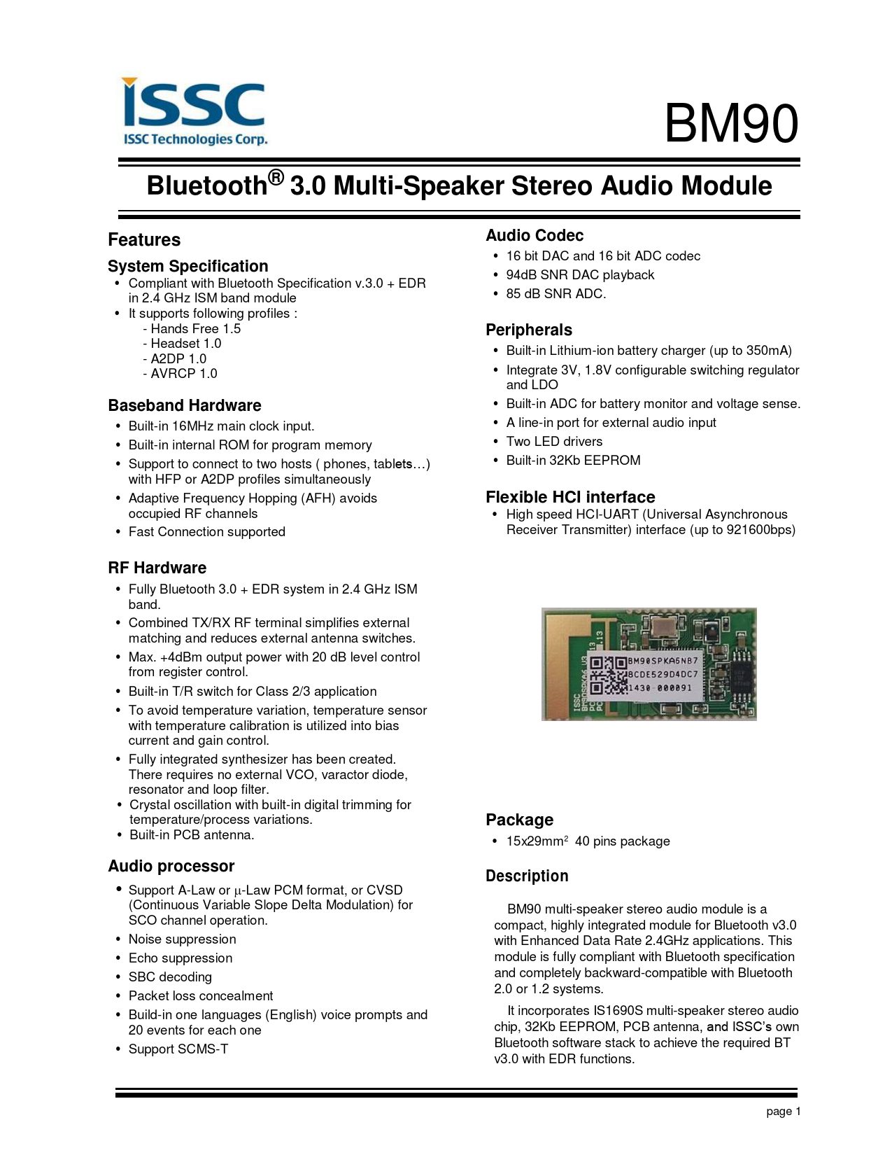 BM90 Bluetooth® 3.0 Multi-Speaker Stereo Audio ModuleFeaturesAudio Codec 16 bit DAC and 16 bit ADC codec System Specification 94dB SNR DAC playback Compliant with Bluetooth Specification v.3.0 + EDR in 2.4 GHz ISM band module 85 dB SNR ADC. It supports following profiles : - Hands Free 1.5 Peripherals - Headset 1.0 Built-in Lithium-ion battery charger (up to 350mA) - A2DP 1.0 - AVRCP 1.0 Integrate 3V, 1.8V configurable switching regulator and LDO Baseband Hardware Built-in ADC for battery monitor and voltage sense. Built-in 16MHz main clock input. A line-in port for external audio input Built-in internal ROM for program memory Two LED drivers Support to connect to two hosts ( phones, tablets…) Built-in 32Kb EEPROM with HFP or A2DP profiles simultaneously Adaptive Frequency Hopping (AFH) avoids Flexible HCI interface occupied RF channels High speed HCI-UART (Universal Asynchronous Fast Connection supported Receiver Transmitter) interface (up to 921600bps) RF Hardware Fully Bluetooth 3.0 + EDR system in 2.4 GHz ISM band. Combined TX/RX RF terminal simplifies external matching and reduces external antenna switches. Max. +4dBm output power with 20 dB level control from register control. Built-in T/R switch for Class 2/3 application To avoid temperature variation, temperature sensor with temperature calibration is utilized into bias current and gain control. Fully integrated synthesizer has been created. There requires no external VCO, varactor diode, resonator and loop filter. Crystal oscillation with built-in digital trimming for temperature/process variations. Package Built-in PCB antenna. 15x29mm2 40 pins package Audio processorDescription Support A-Law or -Law PCM format, or CVSD (Continuous Variable Slope Delta Modulation) for BM90 multi-speaker stereo audio module is a SCO channel operation. compact, highly integrated module for Bluetooth v3.0 Noise suppression with Enhanced Data Rate 2.4GHz applications. This Echo suppression module is fully compliant with Bluetooth specification SBC decoding and completely backward-compatible with Bluetooth 2.0 or 1.2 systems. Packet loss concealment Build-in one languages (English) voice prompts and It incorporates IS1690S multi-speaker stereo audio 20 events for each one chip, 32Kb EEPROM, PCB antenna, and ISSC’s own Bluetooth software stack to achieve the required BT Support SCMS-T v3.0 with EDR functions. page 1 Document Outline Bluetooth® 3.0 Multi-Speaker Stereo Audio Module Features Description Applications Table of Contents 1.0 DEVICE OVERVIEW FIGURE 1-1: APPLICATION BLOCK DIAGRAM Audio Interface FIGURE 1-2: Analog audio interface block diagram FIGURE 1-3: Twin Speaker Link block diagram 2.0 Key Features Table 3.0 PIN DESCRIPTION TABLE 3-1: BM90 PIN DESCRIPTION 4.0 SPECIFICATIONS 4.1 SPECIFICATIONS Table 4-1: Absolute Maximum Specifications Table 4-2: Recommended operating condition Table 4-3: Battery Charger Table 4-4: LED driver Table 4-5: Digital IO Table 4-6: Audio codec Digital to Analogue Converter Table 4-7: Audio codec Analogue to Digital Converter Table 4-8: Transmitter section for BDR Table 4-9: Transmitter section for EDR Table 4-10: Receiver section for BDR Table 4-11: Receiver section for EDR 4.2 PRINTED ANTENNA PERFORMANCE Table 4-12: Antenna Parameters FIGURE 4-1: Antenna 3D radiation pattern @2441 MHz 4.3 BQTF INFORMATION FIGURE 4-2: BQTF Information 4.4 CURRENT CONSUMPTION Table 4-13: Single Mode current consumption Table 4-14: Twin Mode: Master current consumption Table 4-15: Twin Mode: Slave current consumption 5.0 APPLICATIONS 5.1 EXTERNAL CONFIGURATION FIGURE 5-1: External Configuration Header Connections TABLE 5-1: SYSTEM CONFIGURATION SETTINGS 5.2 LED DRIVER 5.3 FUNCTION OF PIN TABLE 5-2: IOs for Buttons TABLE 5-3: IOs for added functions 5.4 Adaptive Frequency Hopping (AFH) 5.5 MULTI-SPEAKER 5.5.1 TWIN SPEAKER LINK TECHNOLOGY INTRODUCTION 5.5.1.1 TWIN SPEAKER LINK Figure 5-2 A2DP Twin Speaker Link Diagram 5.6 Mounting Details 5.7 Module Dimension FIGURE 5-3: BM90 module FIGURE 5-4: Outline Dimension FIGURE 5-5: Module Foot print 5.8 Main Board Antenna Area Layout Guide FIGURE 5-6: Mother Board Antenna Area Layout Guide 5.9 RFLOW PROFILE 5.9.1Soldering Recommendations FIGURE 5-7: Reflow profile 6.0 REFERENCE CIRCUIT FIGURE 6-1: BM90 reference circuit 7.0 PACKING INFORMATION 7.1 QR code label information 7.2 Storage standard 7.3 Ordering Information 7.4 Tray Dimensions 7.5 Packing Method