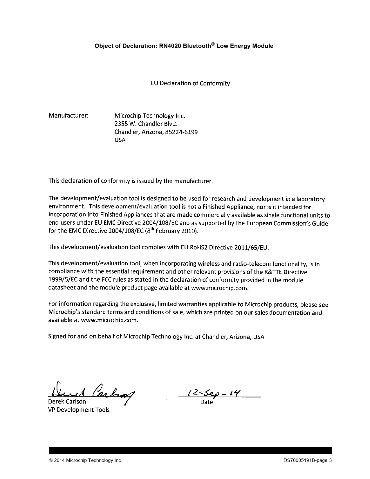 Object of Declaration: RN4020 Bluetooth® Low Energy Module 2014 Microchip Technology Inc. DS70005191B-page 3 Document Outline Preface Introduction Document Layout Conventions Used in this Guide Recommended Reading The Microchip Web Site Development Systems Customer Change Notification Service Customer Support Document Revision History Chapter 1. Introduction 1.1 Bluetooth Low Energy Fundamentals Table 1-1: Characteristic Properties Chapter 2. RN4020 Command Interface 2.1 RN4020 Control Lines Figure 2-1: RN4020 Module Pin Diagram Table 2-1: RN4020 Module Pin Description 2.2 GAP Role Switching Table 2-2: Role Switch Commands 2.3 RN4020 UART-ASCII Command and Responses Table 2-3: RN4020 UART Configuration Table 2-4: Command Descriptions 2.3.1 Set/Get Commands Example 2-1: Set Command Format Table 2-5: UART Baud Rate Settings Table 2-6: SP Level/TX Power Out Table 2-7: Bitmap Features Table 2-8: Bitmap Services Table 2-9: Connection Parameters 2.3.2 Action Commands Table 2-10: Bitmap of “|O” and “|I” Commands 2.3.3 I2C™ Commands Table 2-11: I2C™ Commands 2.3.3.1 Enable I2C 2.3.3.2 Disable I2C 2.3.3.3 I2C EEPROM Access 2.3.3.4 I2C Basic Operations Table 2-12: I2C™ Events 2.3.3.5 Example of Accessing the Microchip I2C EEPROM 24LC512 Figure 2-2: Writing Data via the I2C™ Interface Figure 2-3: Reading Data via the I2C™ Interface 2.3.4 PWM Commands Figure 2-4: PWM Waveform Table 2-13: PWM Parameters 2.3.5 Characteristic Access Commands 2.3.5.1 Definition of Characteristic Access Commands Example 2-2: Listing Client Service and Characteristics 2.3.6 Private Service Configuration Commands Table 2-14: Security flags of characteristic 2.3.7 Microchip MLDP Commands 2.3.7.1 Microchip Low-Energy Data Profile (MLDP) 2.3.7.2 MLDPv2 2.3.8 RN4020 Scripting Commands 2.3.8.1 RN4020 Scripting Capabilities 2.3.8.2 Event Driven Table 2-15: List of Events and Event Labels 2.3.8.3 Comments 2.3.8.4 Variables 2.3.8.5 Remote Function Call Example 2-3: Function Example 2.3.9 RN4020 Script Commands Table 2-16: “WR” Command Input Parameters and Associated Events 2.3.10 Remote Command 2.4 Summary of RN4020 UART Outputs 2.4.1 ASCII Commands with Non-Standard Response Table 2-17: Non-Standard Response for ASCII Commands 2.4.2 UART Response to PIO Switches Table 2-18: UART Response to PIO Events 2.4.3 UART Notifications Table 2-19: UART Notification 2.5 Device Firmware Upgrade 2.5.1 DFU Commands Chapter 3. Application Examples 3.1 Demonstration with a Smart Device 3.1.1 Setup 3.1.2 Running the Demonstration Figure 3-1: Discovering the RN4020 Module Figure 3-2: Reading the Model Number String From the Device Information Service Figure 3-3: Reading Battery Level in Battery Service Figure 3-4: Notification Result of Battery Level Example 3-1: User-Defined Private Services Figure 3-5: Private Services Discovered After Power Cycle Figure 3-6: Reading the Private Characteristic Figure 3-7: Writing Values to Private Characteristics Figure 3-8: Notification to Private Characteristic 3.2 Connecting Two RN4020 Modules 3.2.1 Configure the First Device (Module A) 3.2.2 Configure the Second Device (Module B) 3.2.3 Connecting the Two Devices 3.2.4 Checking Server and Client Services Table 3-1: Module A Server and Client Services Table 3-2: Module B Server and Client Services 3.2.5 Setting the Battery Service 3.3 MLDP Demonstration 3.4 RN4020 Scripting Demonstration 3.4.1 Setting Up Private Service and Characteristics 3.4.2 Script Input 3.4.3 Running the Script Appendix A. PICtail™ Daughter Board Schematics Figure A-1: RN4020 Module Figure A-2: PIC18LF25K50-I/ML Device Figure A-3: 28-pin and 30-pin PICtail™ Connectors Figure A-4: RN4020 Module Breakout Pins Figure A-5: Status LEDs Figure A-6: Voltage Regulator Figure A-7: Decoupling Capacitor for the PIC18LF25K50-I/ML Device Figure A-8: Test Switch Figure A-9: ICSP™ Connector Corporate Office Atlanta Austin, TX Boston Chicago Cleveland Fax: 216-447-0643 Dallas Detroit Houston, TX Indianapolis New York, NY San Jose, CA Canada - Toronto Fax: 852-2401-3431 Australia - Sydney China - Beijing China - Shanghai India - Bangalore Korea - Daegu Korea - Seoul Singapore Taiwan - Taipei Fax: 43-7242-2244-393 Denmark - Copenhagen France - Paris Germany - Dusseldorf Germany - Pforzheim Italy - Milan Italy - Venice Spain - Madrid Worldwide Sales and Service