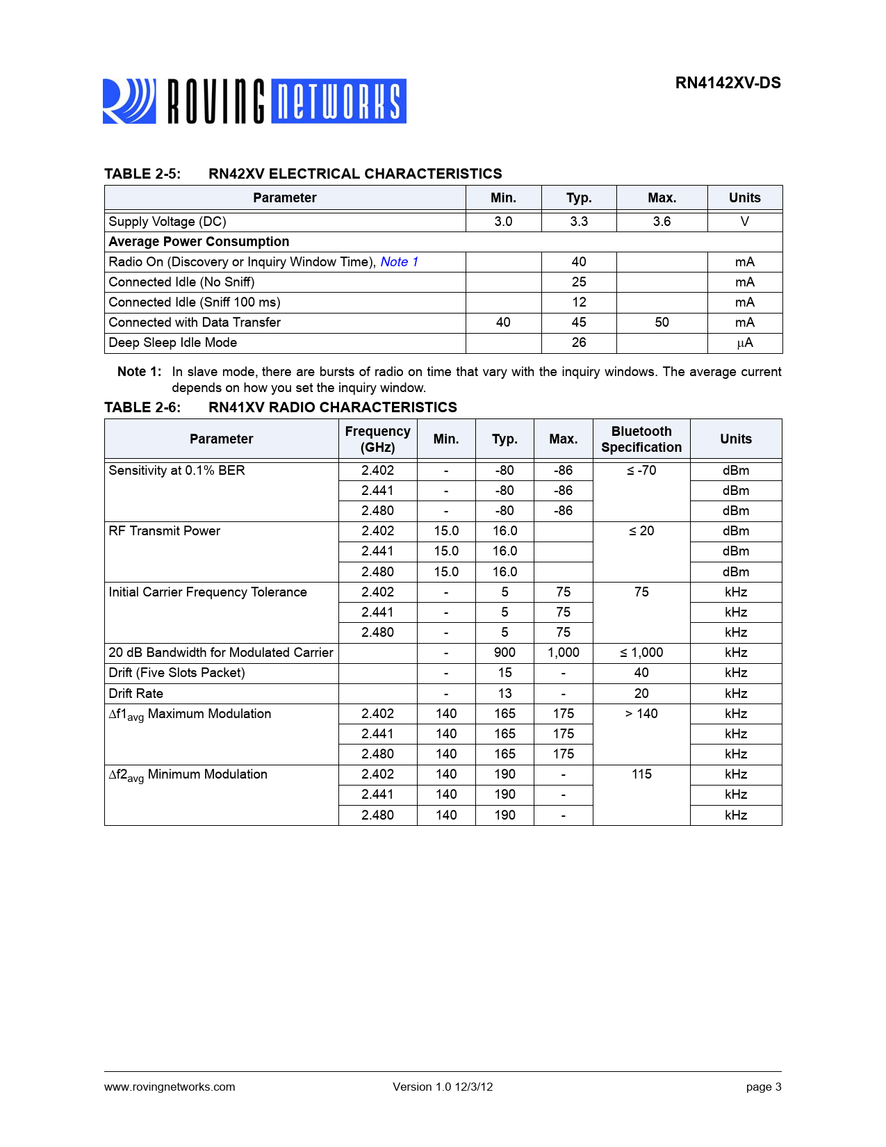 RN4142XV-DS. TABLE 2-5:. RN42XV ELECTRICAL CHARACTERISTICS. Parameter. Min. Typ. Max. Units. Average Power Consumption. Note 1:. TABLE 2-6: