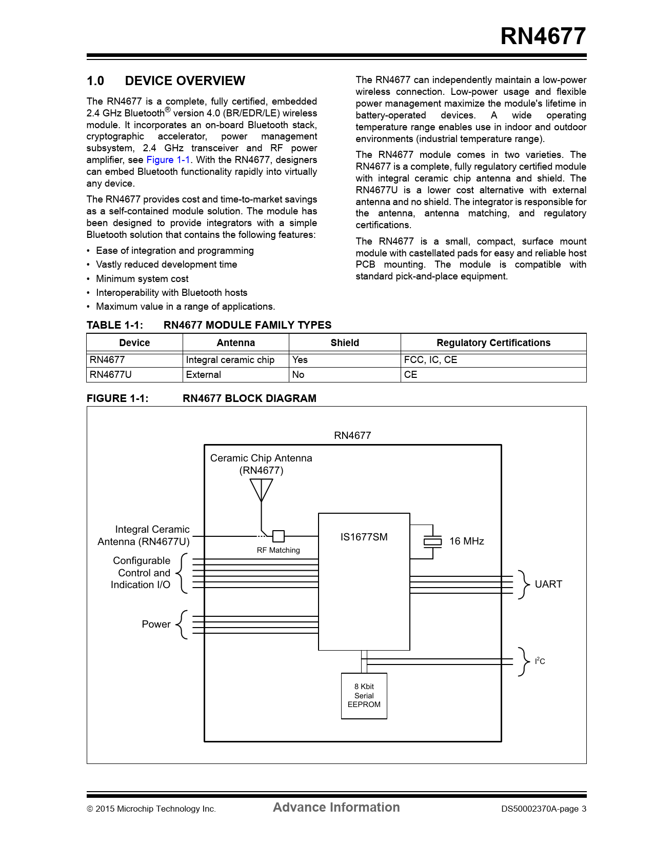 link to page 3 RN46771.0DEVICE OVERVIEW The RN4677 can independently maintain a low-power wireless connection. Low-power usage and flexible The RN4677 is a complete, fully certified, embedded power management maximize the module's lifetime in 2.4 GHz Bluetooth® version 4.0 (BR/EDR/LE) wireless battery-operated devices. A wide operating module. It incorporates an on-board Bluetooth stack, temperature range enables use in indoor and outdoor cryptographic accelerator, power management environments (industrial temperature range). subsystem, 2.4 GHz transceiver and RF power The RN4677 module comes in two varieties. The amplifier, see Figure 1-1. With the RN4677, designers can embed Bluetooth functionality rapidly into virtually RN4677 is a complete, fully regulatory certified module with integral ceramic chip antenna and shield. The any device. RN4677U is a lower cost alternative with external The RN4677 provides cost and time-to-market savings antenna and no shield. The integrator is responsible for as a self-contained module solution. The module has the antenna, antenna matching, and regulatory been designed to provide integrators with a simple certifications. Bluetooth solution that contains the following features: The RN4677 is a small, compact, surface mount • Ease of integration and programming module with castellated pads for easy and reliable host • Vastly reduced development time PCB mounting. The module is compatible with • Minimum system cost standard pick-and-place equipment. • Interoperability with Bluetooth hosts • Maximum value in a range of applications. TABLE 1-1:RN4677 MODULE FAMILY TYPESDeviceAntennaShieldRegulatory Certifications RN4677 Integral ceramic chip Yes FCC, IC, CE RN4677U External No CE FIGURE 1-1:RN4677 BLOCK DIAGRAM RN4677 Ceramic Chip Antenna (RN4677) Integral Ceramic Antenna (RN4677U) IS1677SM 16 MHz RF Matching Configurable Control and Indication I/O UART Power I2C 8 Kbit Serial EEPROM 2015 Microchip Technology Inc. Advance Information DS50002370A-page 3 Document Outline Bluetooth® 4.0 Dual Mode Module Features Operational RF/Analog Data Throughput MAC/Baseband/Higher Layer Antenna Compliance General Description Applications Table of Contents Most Current Data Sheet Errata Customer Notification System 1.0 Device Overview TABLE 1-1: RN4677 Module Family Types FIGURE 1-1: RN4677 Block Diagram 1.1 Interface Description FIGURE 1-2: RN4677 PIN Diagram FIGURE 1-3: RN4677U PIN Diagram TABLE 1-2: PIN Description 1.2 Configuring the RN4677 1.3 UART Interface 1.4 Control and Indication I/O Pins TABLE 1-3: Configuration And Indication I/O Assignments 1.5 Status Indication I/O Pins TABLE 1-4: Status Indication 1.6 Software Button (SW_BTN) 1.7 WAKE UP (WAKEUP) 1.8 RESET (RST_N) 1.9 Status LED (LED1) 1.10 System Configuration 1.11 Power TABLE 1-5: system configuration settings FIGURE 1-4: RN4677 To MCU Interface Example - LDO FIGURE 1-5: RN4677 To MCU Interface Example - Battery 1.12 Mounting Details 1.13 Soldering Recommendations FIGURE 1-6: RN4677 Module Dimensions FIGURE 1-7: RN4677 Recommended PCB Footprint FIGURE 1-8: RN4677 Host PCB Mounting Suggestion 2.0 Application Information 2.1 RN4677 Ceramic Chip Antenna FIGURE 2-1: RN4677 Antenna Radiation Pattern 2.2 External Configuration and Programming FIGURE 2-2: External Programming Header Connections 3.0 Regulatory Approval 3.1 United States 3.1.1 LABELING AND USER INFORMATION REQUIREMENTS 3.1.2 RF EXPOSURE 3.1.3 HELPFUL WEB SITES 3.2 Canada 3.2.1 LABELING AND USER INFORMATION REQUIREMENTS 3.2.2 RF EXPOSURE 3.2.3 APPROVED EXTERNAL ANTENNA TYPES 3.2.4 HELPFUL WEB SITES 3.3 Europe 3.3.1 LABELING AND USER INFORMATION REQUIREMENTS 3.3.2 EXTERNAL ANTENNA REQUIREMENTS 3.3.3 HELPFUL WEB SITES TABLE 3-1: European Compliance Testing 4.0 Electrical Characteristics TABLE 4-1: Environmental Conditions TABLE 4-2: Electrical Characteristics TABLE 4-3: Supply Consumption-Classic(1) TABLE 4-4: Supply Consumption-low Energy(1) TABLE 4-5: UART Baud 5.0 Ordering Information TABLE 5-1: Ordering Information Appendix A: Revision History Revision A (May 2015) The Microchip Web Site Customer Change Notification Service Customer Support Product Identification System Worldwide Sales and Service