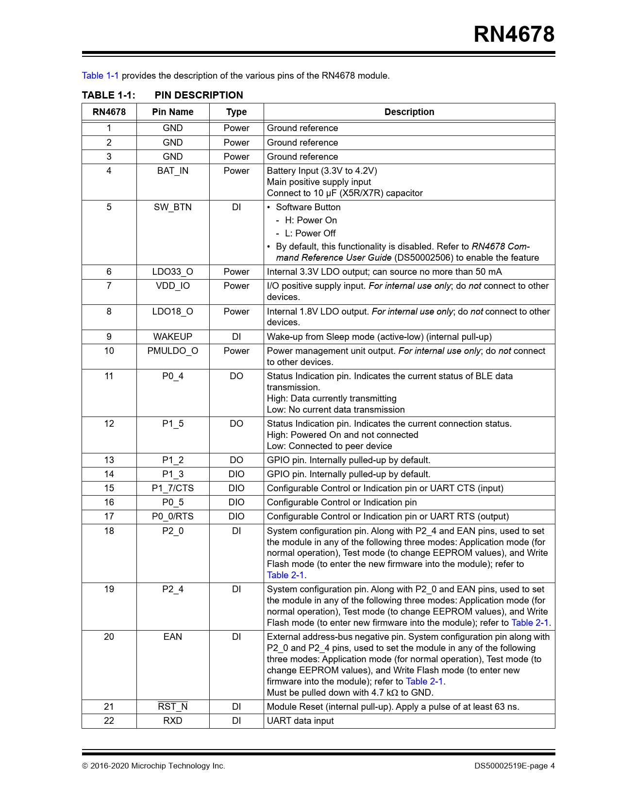 1 GND Power Ground reference 2 GND Power Ground reference 3 GND Power Ground reference 4 BAT_IN Power Battery Input (3.3V to 4.2V) Main positive supply input Connect to 10 µF (X5R/X7R) capacitor 5 SW_BTN DI • Software Button - H : Powe r On - L : Powe r Off • By default, this functionality is disabled. Refer to RN4678 Com- mand Reference User Guide (DS50002506) to enable the feature 6 LDO33_O Power Internal 3.3V LDO output; can source no more than 50 mA 7 VDD_IO Power I/O positive supply input. For internal use only; do not connect to other devices. 8 LDO18_O Power Internal 1.8V LDO output. For internal use only; do not connect to other devices. 9 WAKEUP DI Wake-up from Sleep mode (active-low) (internal pull-up) 10 PMULDO_O Power Power management unit output. For internal use only; do not connect to other devices. 11 P0_4 DO Status Indication pin. Indicates the current status of BLE data transmission. High: Data currently transmitting Low: No current data transmission 12 P1_5 DO Status Indication pin. Indicates the current connection status. High: Powered On and not connected Low: Connected to peer device 13 P1_2 DO GPIO pin. Internally pulled-up by default. 14 P1_3 DIO GPIO pin. Internally pulled-up by default. 15 P1_7/CTS DIO Configurable Control or Indication pin or UART CTS (input) 16 P0_5 DIO Configurable Control or Indication pin 17 P0_0/RTS DIO Configurable Control or Indication pin or UART RTS (output) 18 P2_0 DI System configuration pin. Along with P2_4 and EAN pins, used to set the module in any of the following three modes: Application mode (for normal operation), Test mode (to change EEPROM values), and Write Flash mode (to enter the new firmware into the module); refer to Table 2-1. 19 P2_4 DI System configuration pin. Along with P2_0 and EAN pins, used to set the module in any of the following three modes: Application mode (for normal operation), Test mode (to change EEPROM values), and Write Flash mode (to enter new firmware into the module); refer to Table 2-1. 20 EAN DI External address-bus negative pin. System configuration pin along with P2_0 and P2_4 pins, used to set the module in any of the following three modes: Application mode (for normal operation), Test mode (to change EEPROM values), and Write Flash mode (to enter new firmware into the module); refer to Table 2-1. Must be pulled down with 4.7 k to GND. 21 RST_N DI Module Reset (internal pull-up). Apply a pulse of at least 63 ns. 22 RXD DI UART data input  2016-2020 Microchip Technology Inc. DS50002519E-page 4 Document Outline RN4678 Features RF/Analog Data Throughput Operating Conditions MAC/Baseband/Higher Layer Features Applications Description Table of Contents Most Current Data Sheet Errata Customer Notification System 1.0 Device Overview FIGURE 1-1: RN4678 Internal Block Diagram TABLE 1-1: PIN Description FIGURE 1-2: RN4678 PIN DIAGRAM 2.0 Application Information 2.1 Module Configuration 2.2 Flow Control 2.3 Control and Indication I/O Pins 2.4 Power Tree FIGURE 2-1: Power Tree Diagram 2.5 Software Button (SW_BTN) FIGURE 2-2: SW_BTN TIME (HIGH) AT APP MODE(1,2) FIGURE 2-3: SW_BTN TIME (LOW) AT ACCESS STATES(1) FIGURE 2-4: SW_BTN TIME (LOW) AT LINK STATES(1,2) 2.6 WAKE-UP FIGURE 2-5: WAKE-UP TIME(1) 2.7 External Reset FIGURE 2-6: TIMING WAVEFORMS ON RESET (1,2) 2.8 LED Driver FIGURE 2-7: LED Driver 2.9 Host MCU Interface over UART FIGURE 2-8: Power and MCU Interface Example for Rn4678 2.10 Reference Circuit FIGURE 2-9: RN4678 Reference Circuit 3.0 Electrical Characteristics Absolute Maximum Ratings TABLE 3-1: Recommended Operating Conditions TABLE 3-2: 3.3V LDO Electrical Parameters (1,2) TABLE 3-3: PMU LDO(1,2) TABLE 3-4: SAR-ADC AND Battery Voltage Detector TABLE 3-5: Intensity Controllable LED Driver TABLE 3-6: Power Consumption-Classic(1) TABLE 3-7: Power Consumption-Low Energy(1,2) 4.0 Radio Characteristics TABLE 4-1: Transmitter Performance (1,2) TABLE 4-2: Receiver Performance(1) 5.0 Physical Dimensions FIGURE 5-1: RN4678 Module Dimensions FIGURE 5-2: RN4678 Recommended PCB Footprint FIGURE 5-3: RN4678 Host PCB Mounting Suggestion 6.0 Reflow profile FIGURE 6-1: Reflow Profile 7.0 Module Placement FIGURE 7-1: Module Placement Examples TABLE 7-1: Recommended Antenna FIGURE 7-2: Keep Out Area Recommended for Antenna 7.1 RN4678 Ceramic Chip Antenna FIGURE 7-3: RN4678 Antenna Radiation Pattern 8.0 Ordering Information TABLE 8-1: Ordering Information 9.0 Regulatory Approval 9.1 United States 9.2 Canada 9.3 Europe TABLE 9-1: EUROPEAN COMPLIANCE TESTING 9.4 Japan 9.5 Korea 9.6 Taiwan 9.7 China 9.8 Other Regulatory Information Appendix A: Revision History The Microchip WebSite Product Identification System Trademarks Worldwide Sales