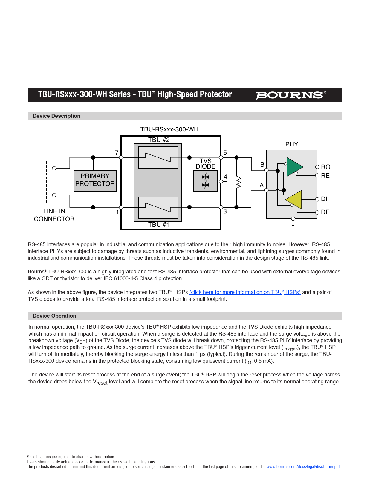 TBU-RSxxx-300-WH Series - TBU® High-Speed ProtectorDevice Description TBU-RSxxx-300-WH TBU #2 PHY 7 5 TVS B DIODE RO PRIMARY 4 RE PROTECTOR A DI LINE IN 1 3 DE CONNECTOR TBU #1 RS-485 interfaces are popular in industrial and communication applications due to their high immunity to noise. However, RS-485 interface PHYs are subject to damage by threats such as inductive transients, environmental, and lightning surges commonly found in industrial and communication installations. These threats must be taken into consideration in the design stage of the RS-485 link. Bourns® TBU-RSxxx-300 is a highly integrated and fast RS-485 interface protector that can be used with external overvoltage devices like a GDT or thyristor to deliver IEC 61000-4-5 Class 4 protection. As shown in the above figure, the device integrates two TBU® HSPs (click here for more information on TBU® HSPs) and a pair of TVS diodes to provide a total RS-485 interface protection solution in a small footprint. Device Operation In normal operation, the TBU-RSxxx-300 device’s TBU® HSP exhibits low impedance and the TVS Diode exhibits high impedance which has a minimal impact on circuit operation. When a surge is detected at the RS-485 interface and the surge voltage is above the breakdown voltage (VBR) of the TVS Diode, the device’s TVS diode will break down, protecting the RS-485 PHY interface by providing a low impedance path to ground. As the surge current increases above the TBU® HSP’s trigger current level (Itrigger), the TBU® HSP will turn off immediately, thereby blocking the surge energy in less than 1 μs (typical). During the remainder of the surge, the TBU- RSxxx-300 device remains in the protected blocking state, consuming low quiescent current (IQ, 0.5 mA). The device will start its reset process at the end of a surge event; the TBU® HSP will begin the reset process when the voltage across the device drops below the Vreset level and will complete the reset process when the signal line returns to its normal operating range. Specifications are subject to change without notice. Users should verify actual device performance in their specific applications. The products described herein and this document are subject to specific legal disclaimers as set forth on the last page of this document, and at www.bourns.com/docs/legal/disclaimer.pdf.